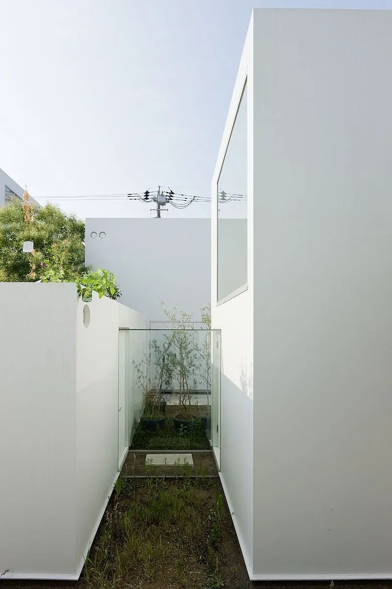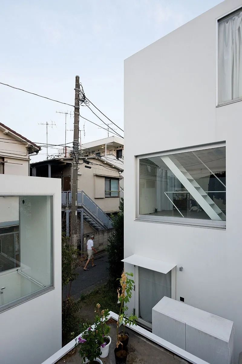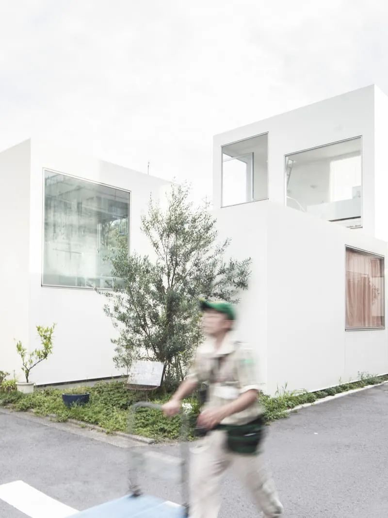 位於東京的森山邸,由西澤立衛設計建造於2002至2005年之間。一眼望去,森山邸的平面佈置並不像一座典型的住宅。它沒有獨立圍合的單體建築,而是由十個棱柱般的單體按照特定角度細緻排列在場地。如同被無形的力量牽引,每個體量間並不互相接觸。纖細的鋼結構外刷了一層白漆,讓人聯想到醫院診室。每個單體的門窗開洞皆是方形或長方形,像被手術刀精準切割過。