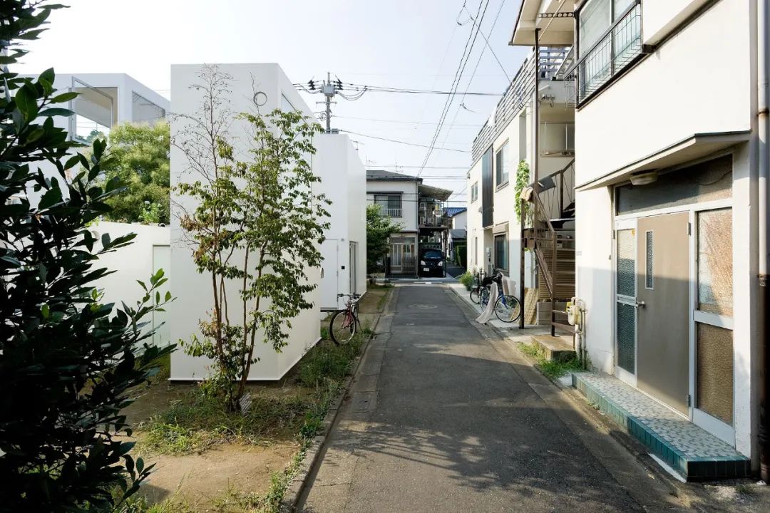 行走在蜿蜒的園中小徑,住戶透過單體間隙可以一眼望到街景,緩慢行駛的腳踏摩托,投件的郵差,身著傳統和服推著塑料箱前行的婦人。對森山邸瞭解越深,越會發覺看似分散的結構組織與其說是安身之處,不如說是為被其吸引來的離群索居的住戶們提供的公共生活支援。