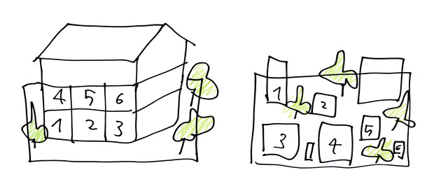 西澤立衛構想了一個由“單元”組成的“集合體”,他以字母A-I的順序為這些單元編號。其中一些單元承擔著獨立的功能,比如單獨作為起居空間的“C”單元,作為洗漱間的“D”單元。另外5個單元具有更複雜完整的功能,就像一個獨立的小公寓。每個單元之間的間距都幾乎相等,保證了每個小公寓都有自己的小花園,住戶可以在這裡種蔬菜、晾衣服或者露天辦公。