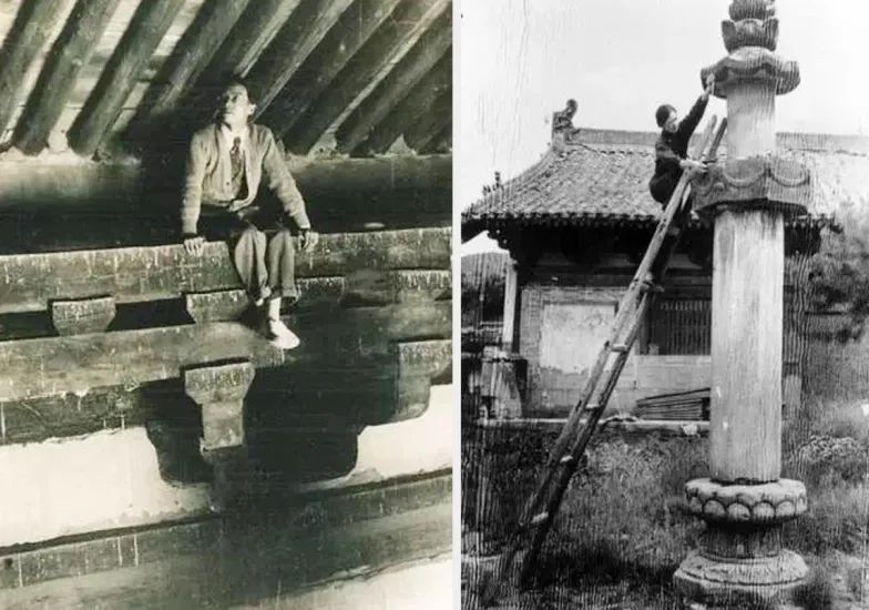 左圖:梁思成在測繪善化寺普賢閣斗拱後尾;右圖:1937年林徽因在山西五台山佛光寺測繪唐代經幢