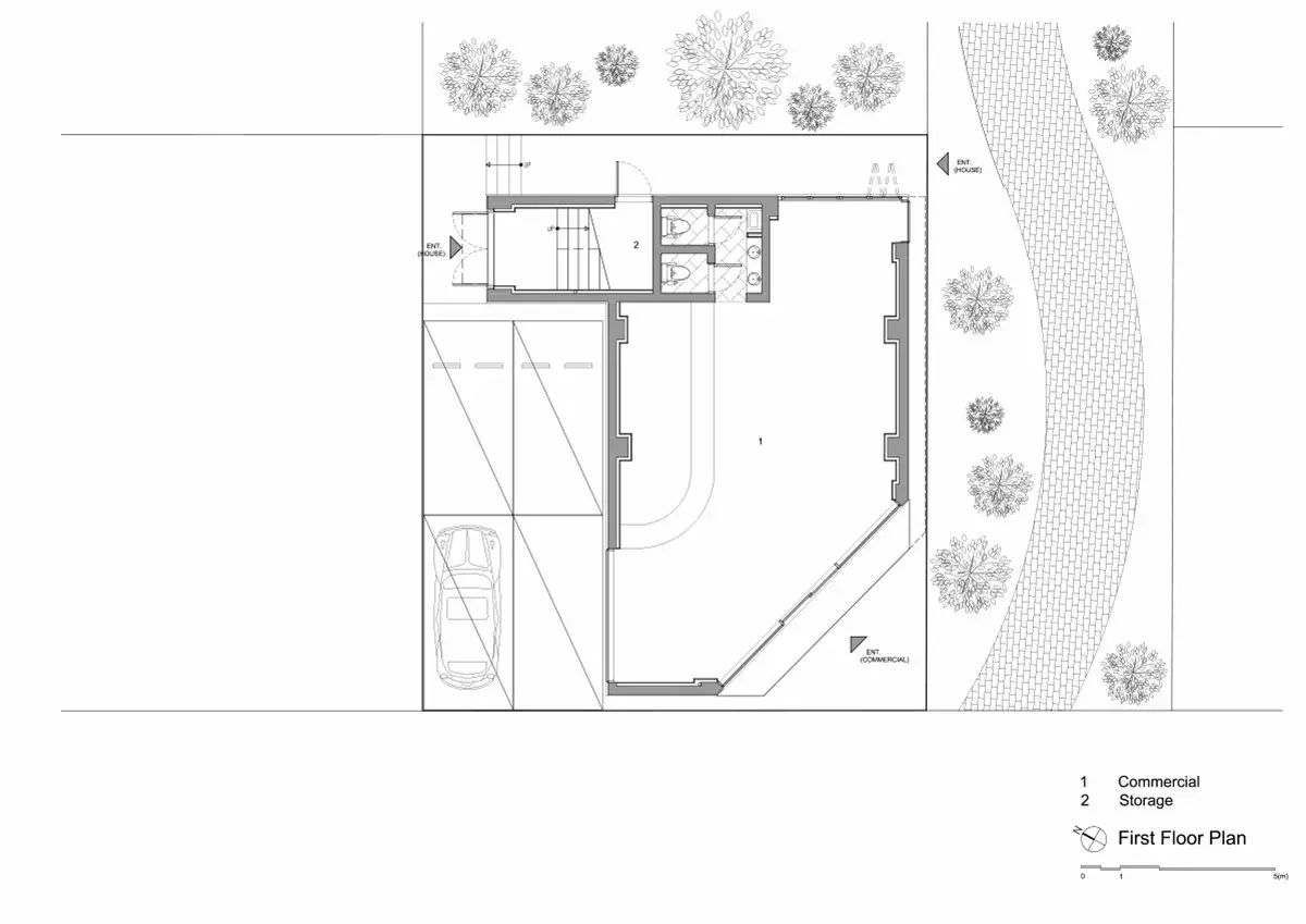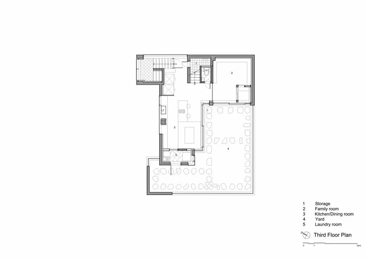 住宅的底層擺闊一些商業空間同樣也可以停車。主要的起居居住功能安排在二層,二層還有一間休息室,一間小廚房和就餐空間等。三樓有室外平台,旁邊是公共的家庭房和一間大廚房,家庭的休息住宿主要安排在住宅的最高層。