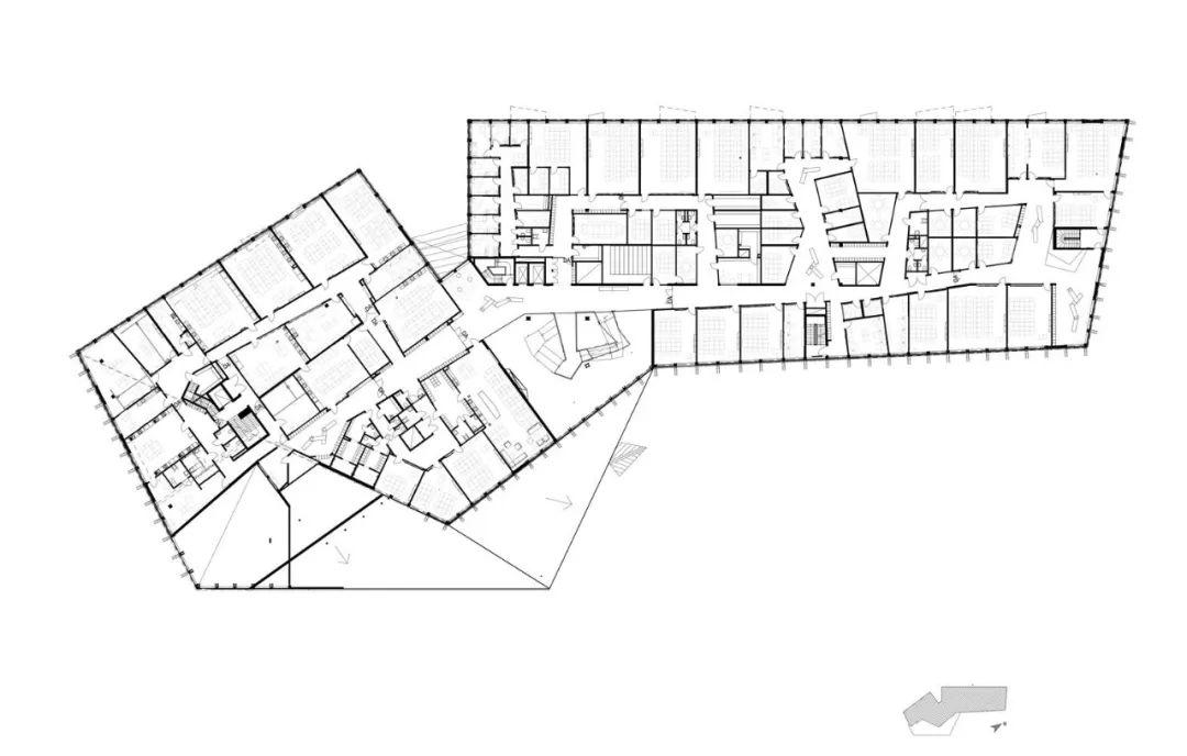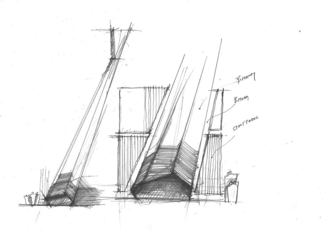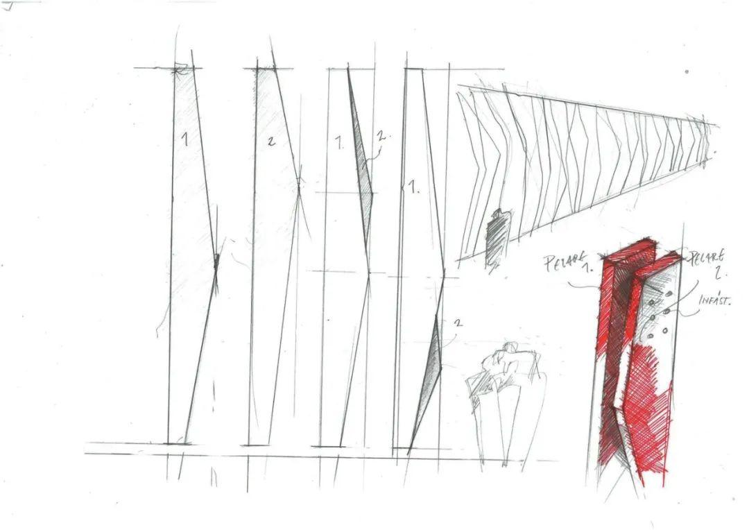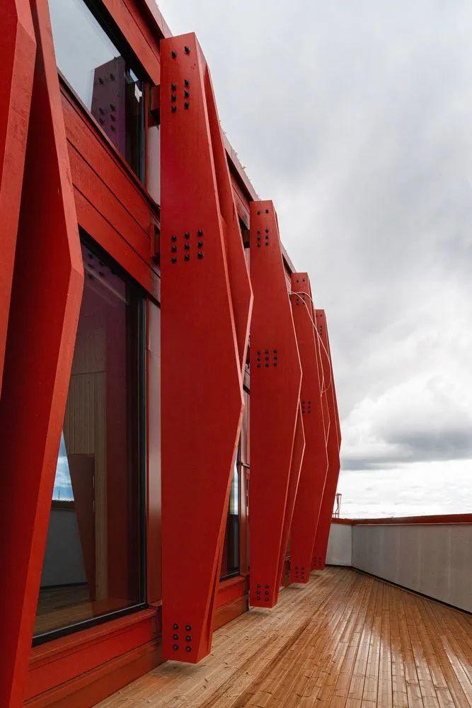 立面由膠合層積木和配有垂直木柱的玻璃帷幕牆構成,位於內部承重結構外圍。每組木柱都有著不同的形狀和切口,木柱成對設置,形成多樣形態。