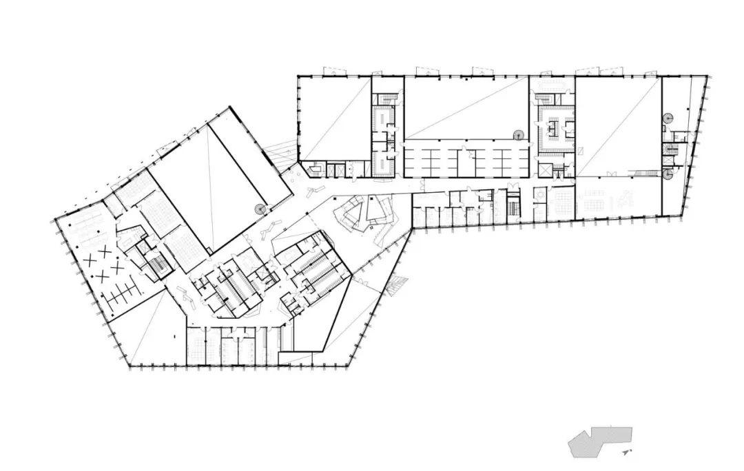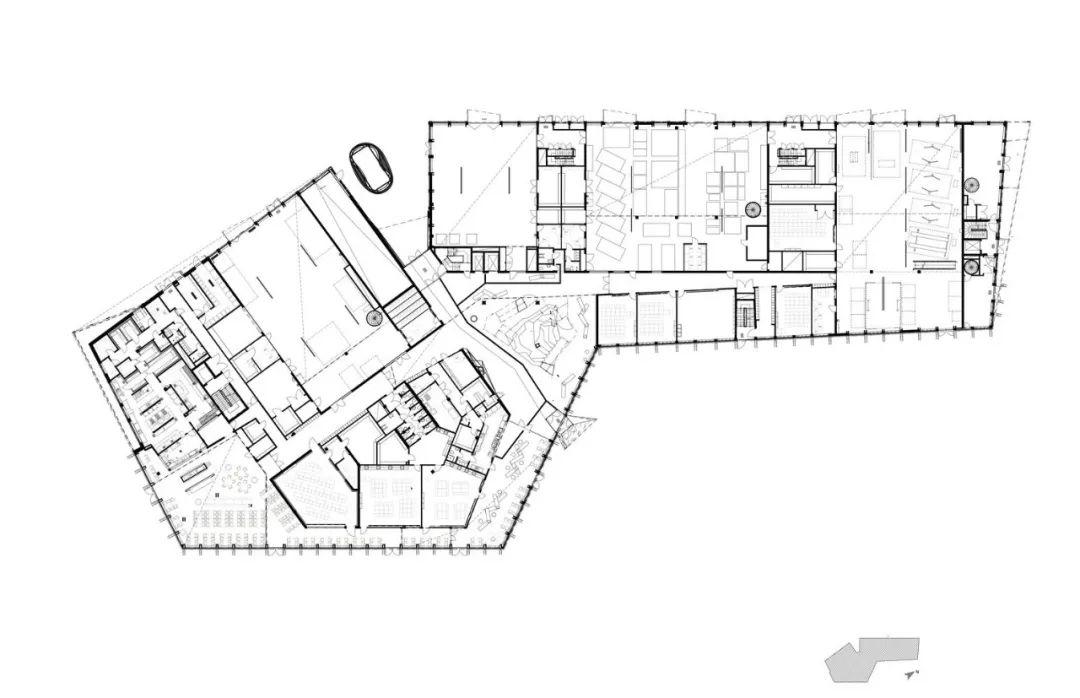 當路人經過這所學校,會感覺到一種變幻和韻律,從某個角度看過去,學校呈現堅固結實的樣貌,從別的角度看去,變得十分通透;學生、教職員和訪客可經由一座黃銅飾面的入口,進入學校的核心空間。