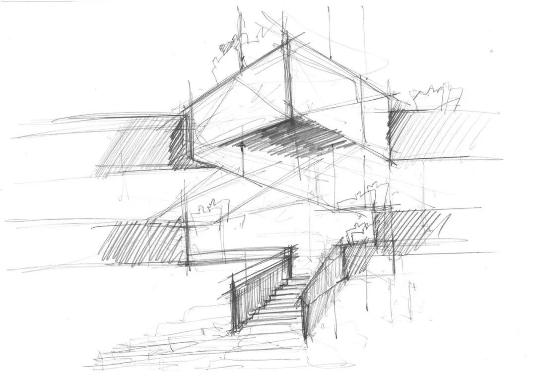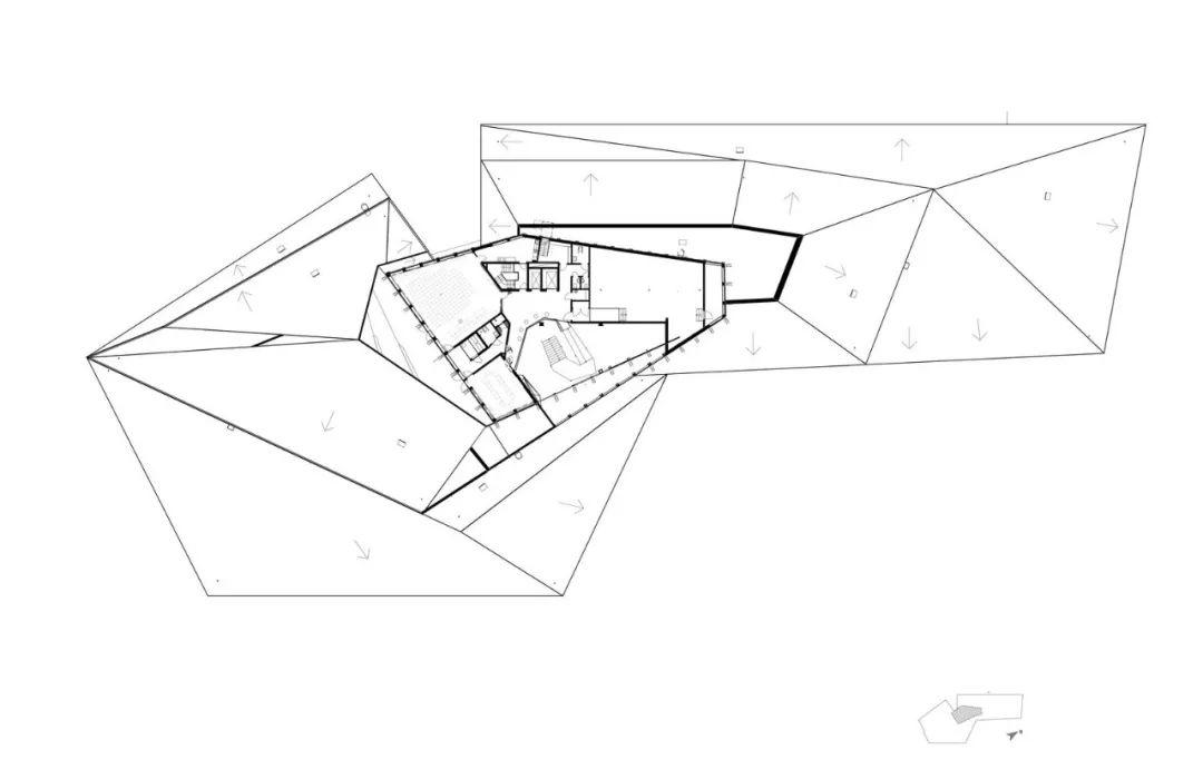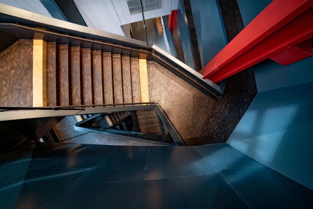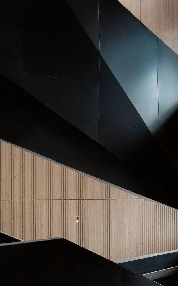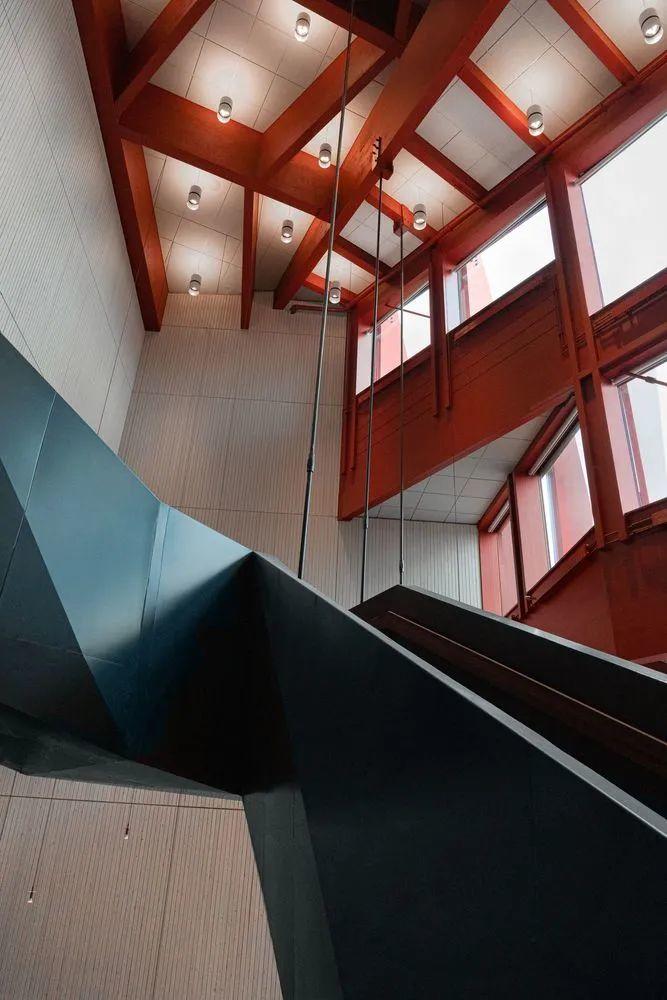 經過入口,寬敞的門廳印入眼簾,令人印象深刻的挑高空間,噼啪作響的溫暖壁爐,加上一座專屬於此的獨特樓梯,通往能欣賞到絕美山景的上層空間。樓梯包裹著深色波紋鋼,橡木塊製成的階梯突出其間,樓梯在與地面層地面銜接處變為階梯狀的座位,供學生們休閒聚會。