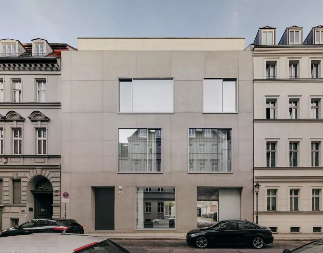 Chipperfield 在接受了重建Neuses Museum的項目從英國搬到了柏林。他的工作室住在一棟三層的混凝土房子裡,面對一個半公共的庭院,庭院裡有一個為當地人設計的餐廳。室內簡樸的混凝土牆壁由兩種顏色來平衡,天鵝絨沙發的綠色和分隔廚房和客廳空間的書架的橙色相得益彰。