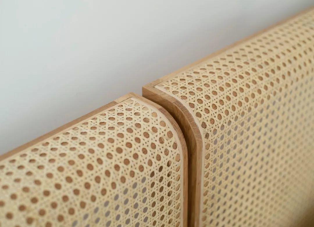 木質的床頭板與藤編元素相結合,優雅大氣且十分沉穩,表面有許多種材料可供選擇,胡桃木、白橡木、楓木等等,可根據需要進行客製化。