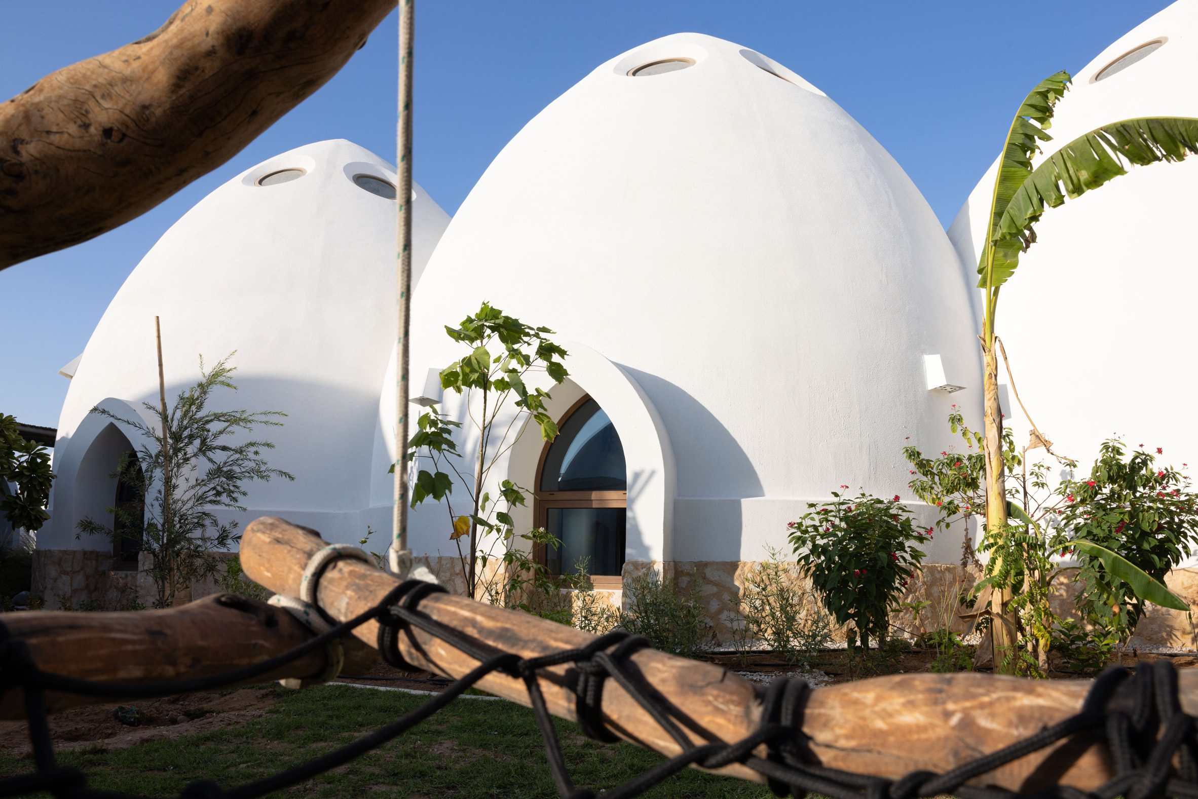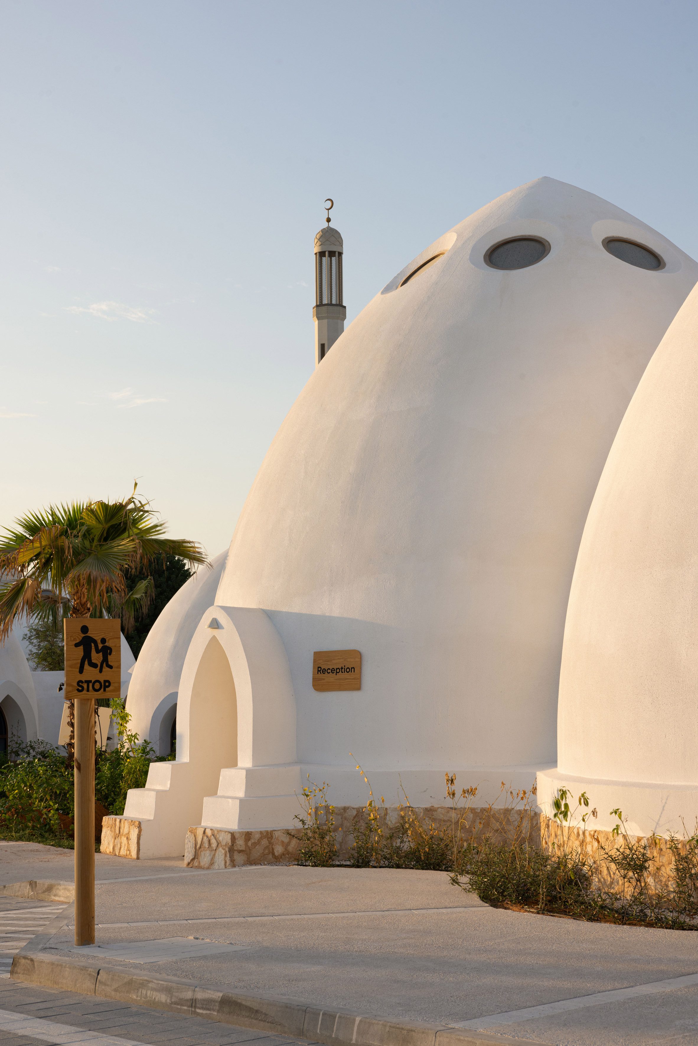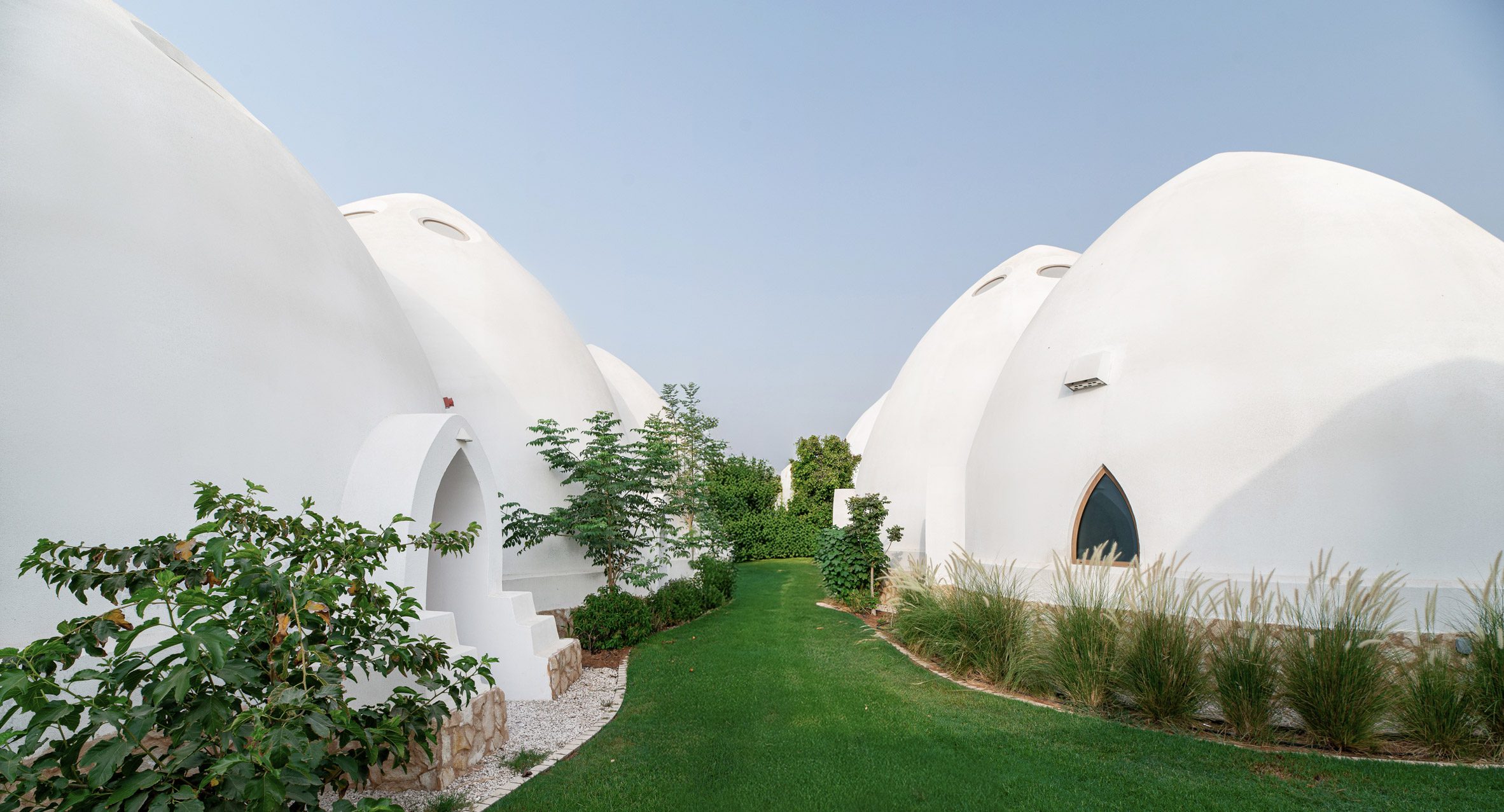 在杜拜的納阿勒舍巴(Nab Al Sheba)社區,一連串的白色尖頂圓拱教室,如雨後春筍般圍繞著蜿蜒的小徑錯落分布,形成了艾爾法納學校(Al Fanar School)別開生面的校園景觀。這些混凝土構築的穹頂教室,時而兩兩成雙,時而三四成群,環抱著精心佈置的庭園與遊戲區。