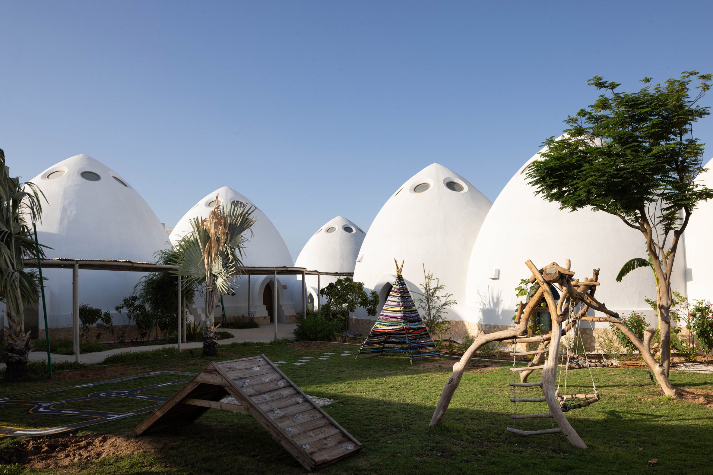 艾爾法納學校的規劃並未止步於教室與遊戲區。整體校園還囊括了行政辦公樓宇及多元的社區設施,形成一個完整的教育聚落。更值得稱道的是,Emkaan事務所與本地致力於自然活動的團體Natura Tribe攜手合作,共同規劃了校園的景觀與一座別具意義的教育農場。這座農場不僅開闢了蔬菜種植區,更為雞隻與陸龜等小動物提供了棲息的空間。這樣的規劃,將生命教育與環境關懷融入日常,讓學生在親身實踐中學習尊重生命與自然,構築了一個從知識學習到品格養成的全方位教育生態系統。
