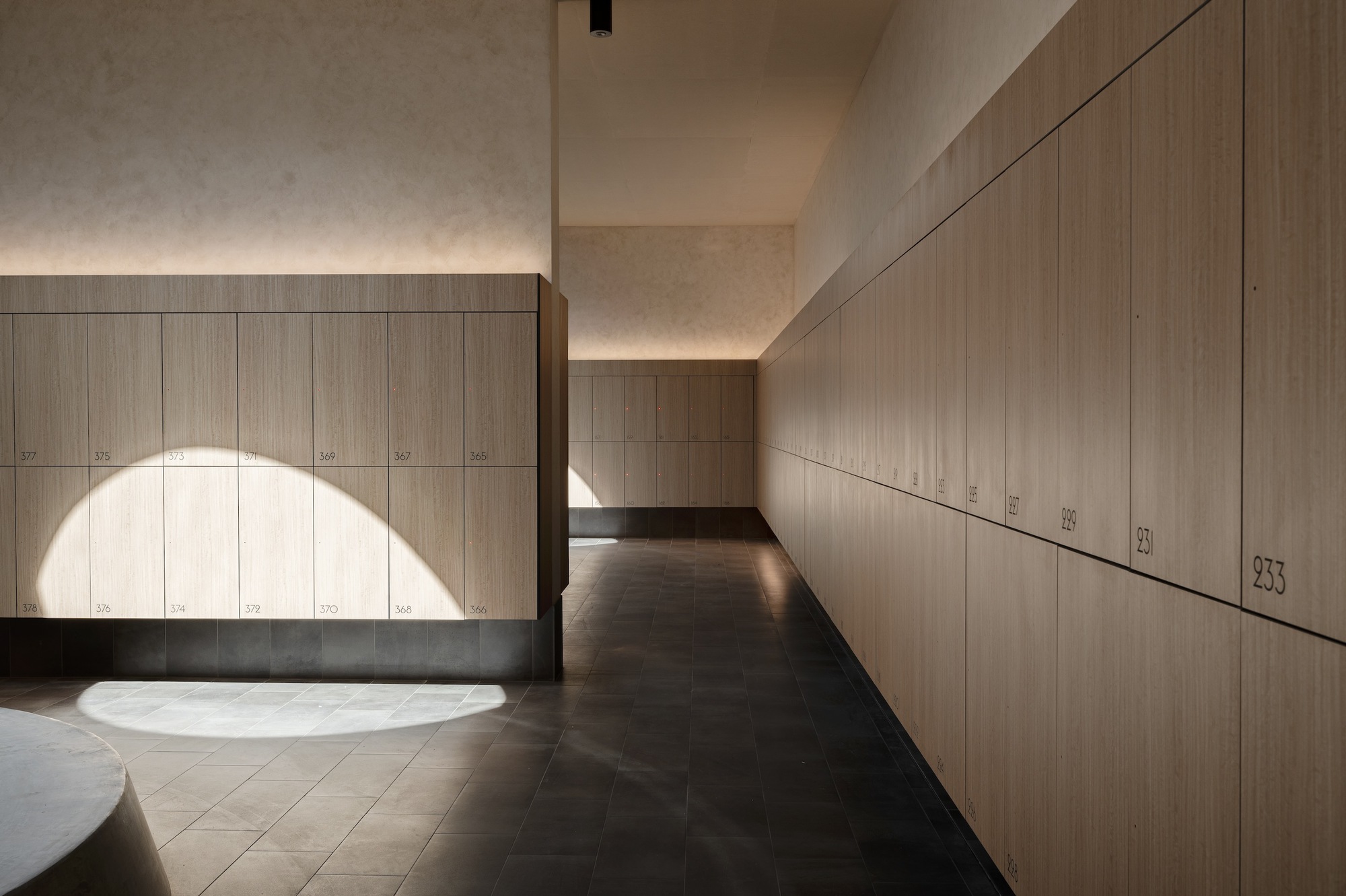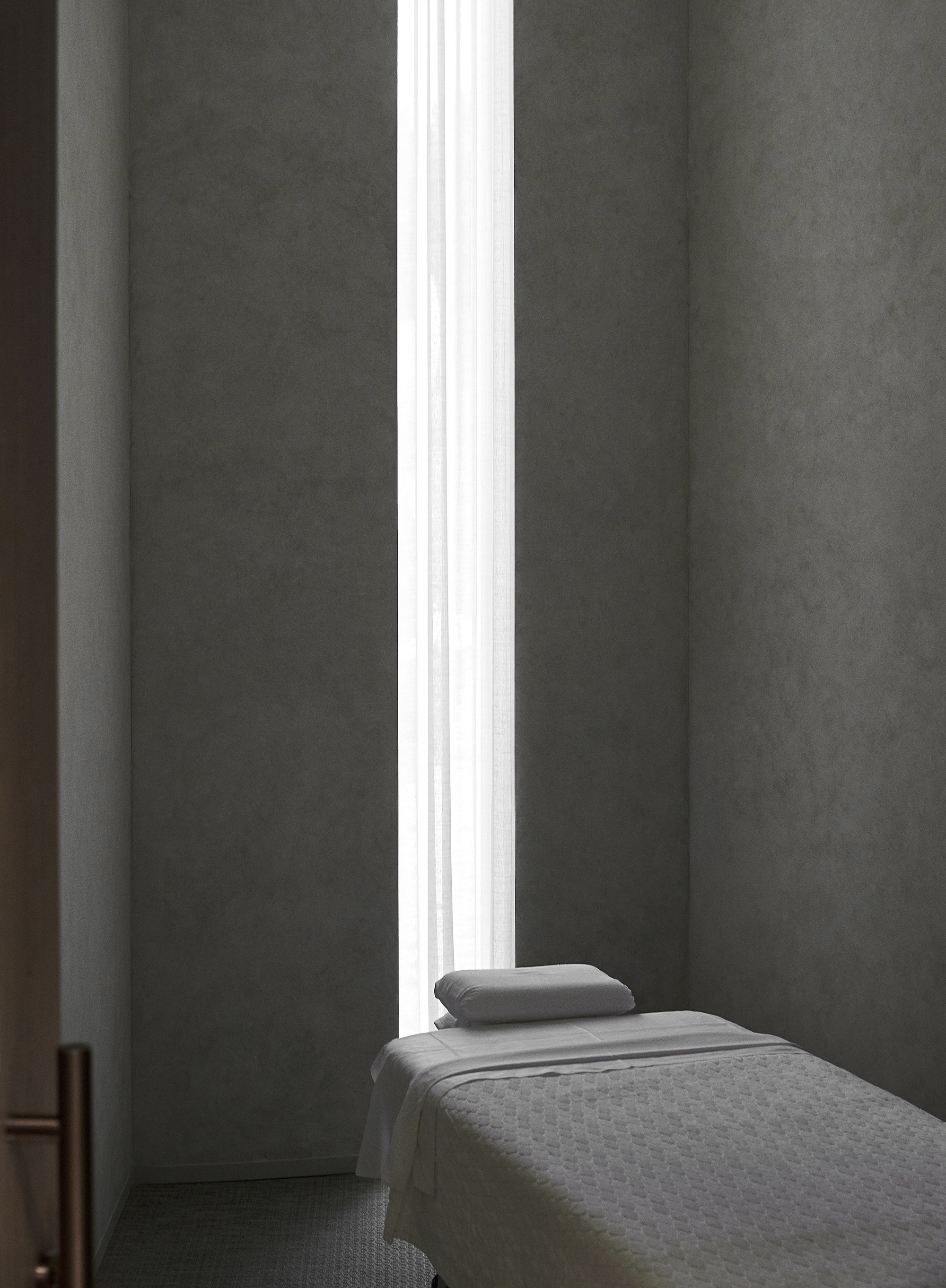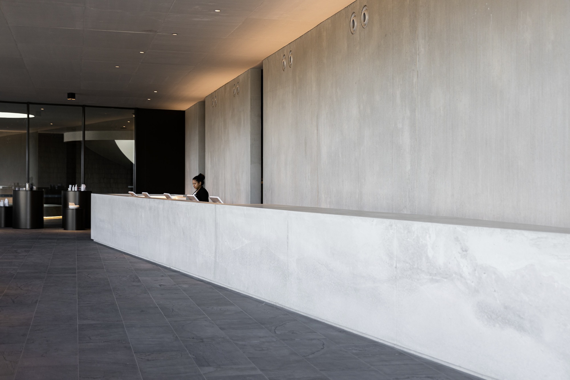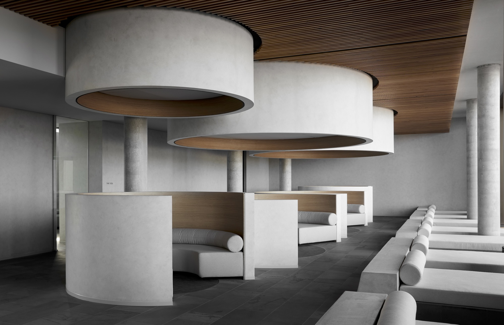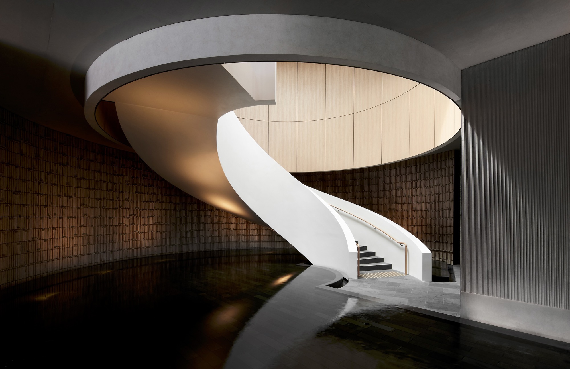 螺旋樓梯從一個反光的室內水池中升起,不僅作為一座雕塑般的特色景觀,更是區分公共與私人空間的機制,提升了抵達過程的儀式感。圓形作為無始無終的符號,象徵著水療所追求的生生不息與循環再生。這種簡約洗鍊的內飾,意圖讓訪客的感官焦點,回歸到水療本身的放鬆與療癒上。