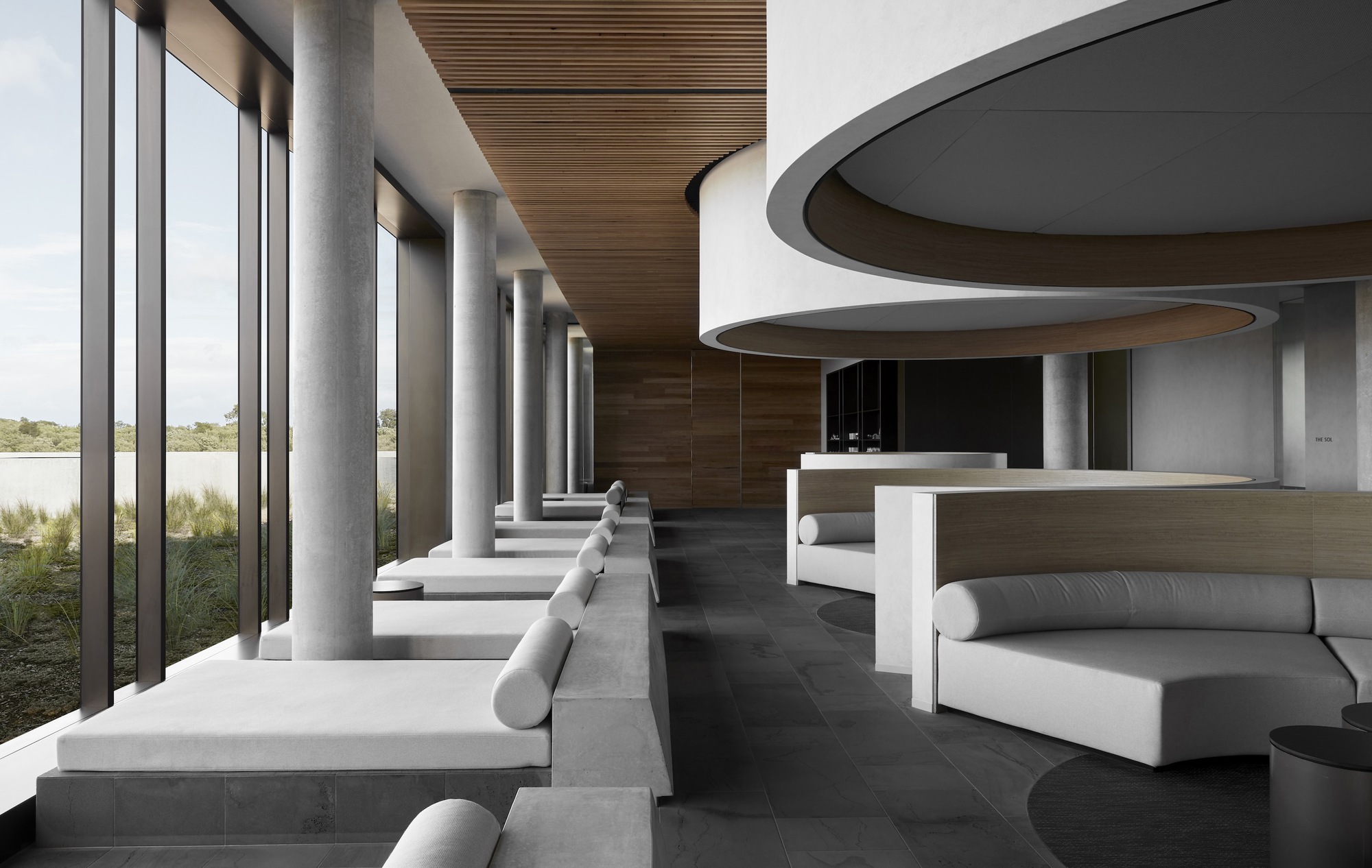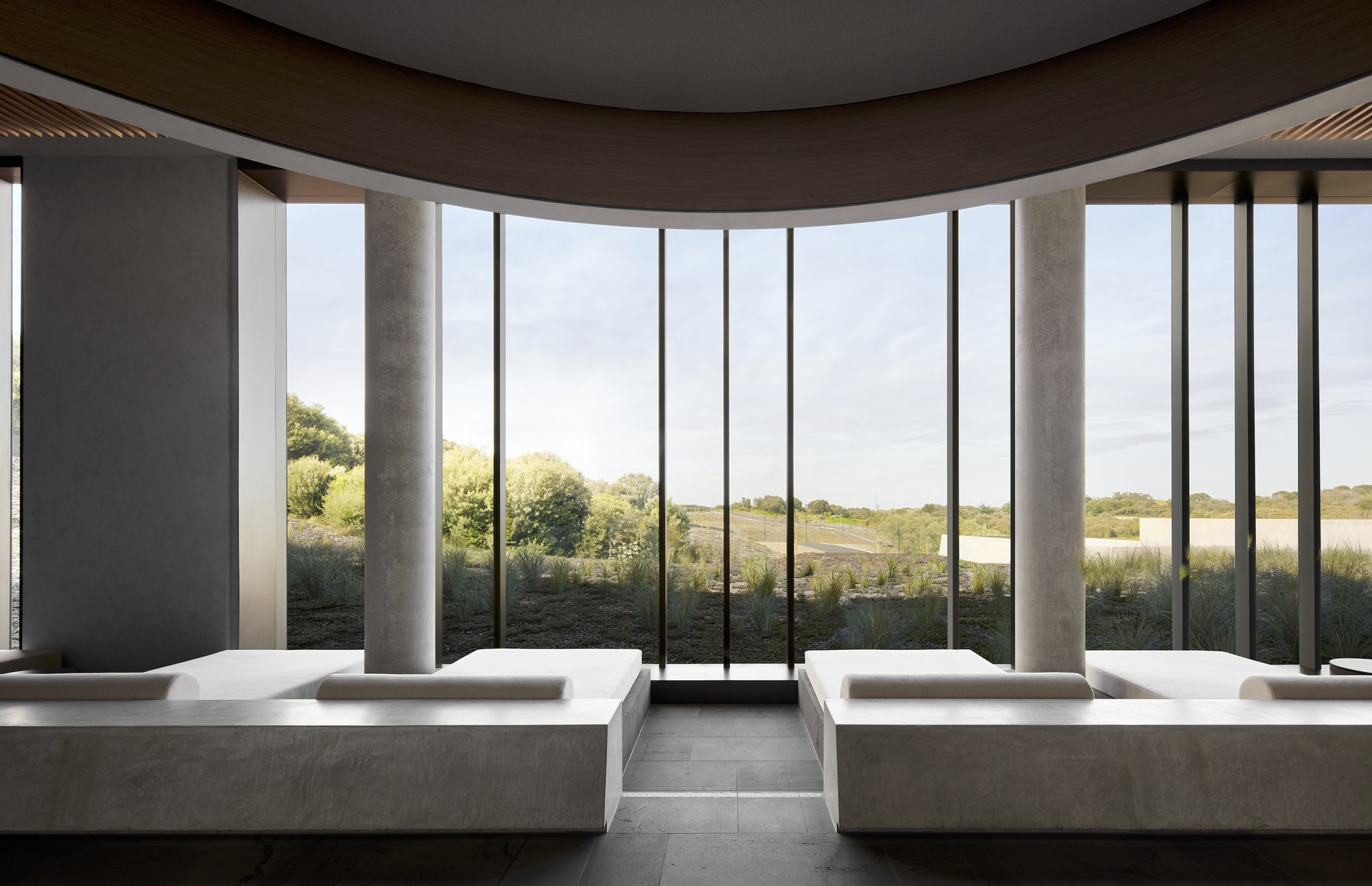 原始的材質感在室內空間中得到淋漓發揮。一面由手工西班牙磚鋪設而成的特色牆,與混凝土柱和地坪形成了鮮明對比,再輔以溫潤的木飾面,使得整體視覺得以柔化。在休憩區與水療室中,設計師引入了澳洲本土的植物元素,例如:紅千層、尤加利樹果實和海螺殼,將原生自然帶入室內。天然的觸覺材料與和諧的色調調色板,讓室內外空間的連貫性得到了有效強化。這種對原生環境的具體參照,為使用者創造親生命性的深度連結。
