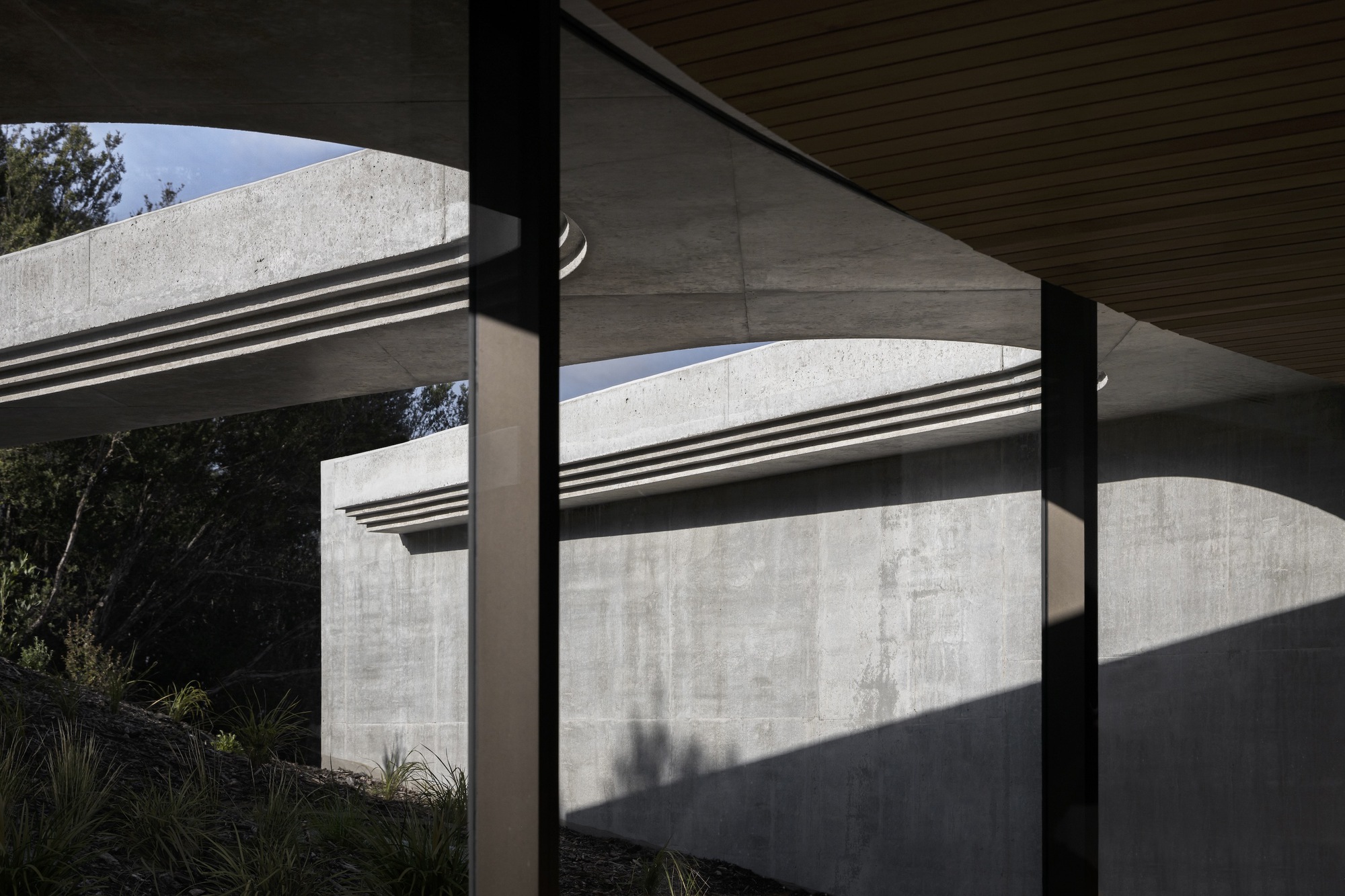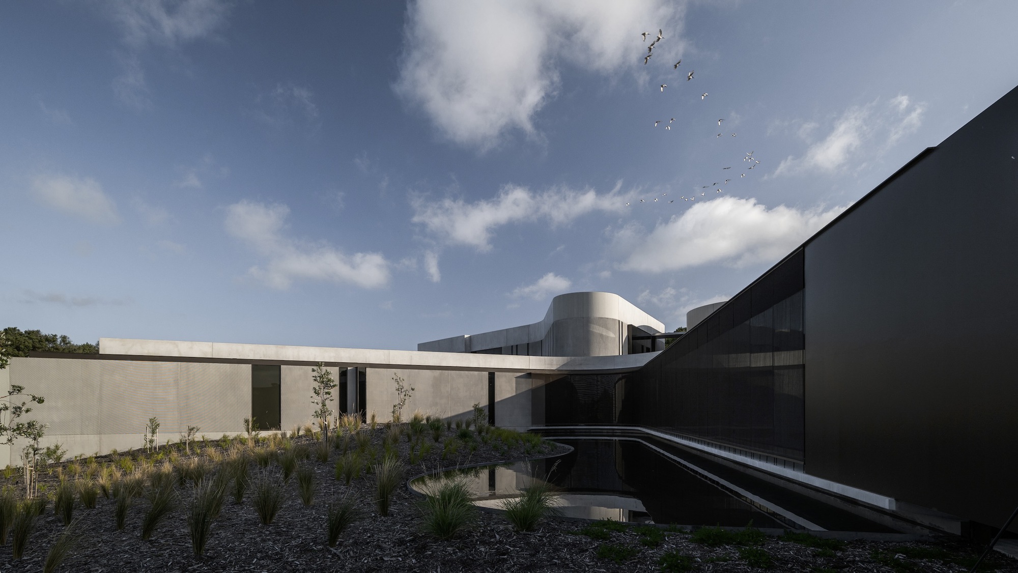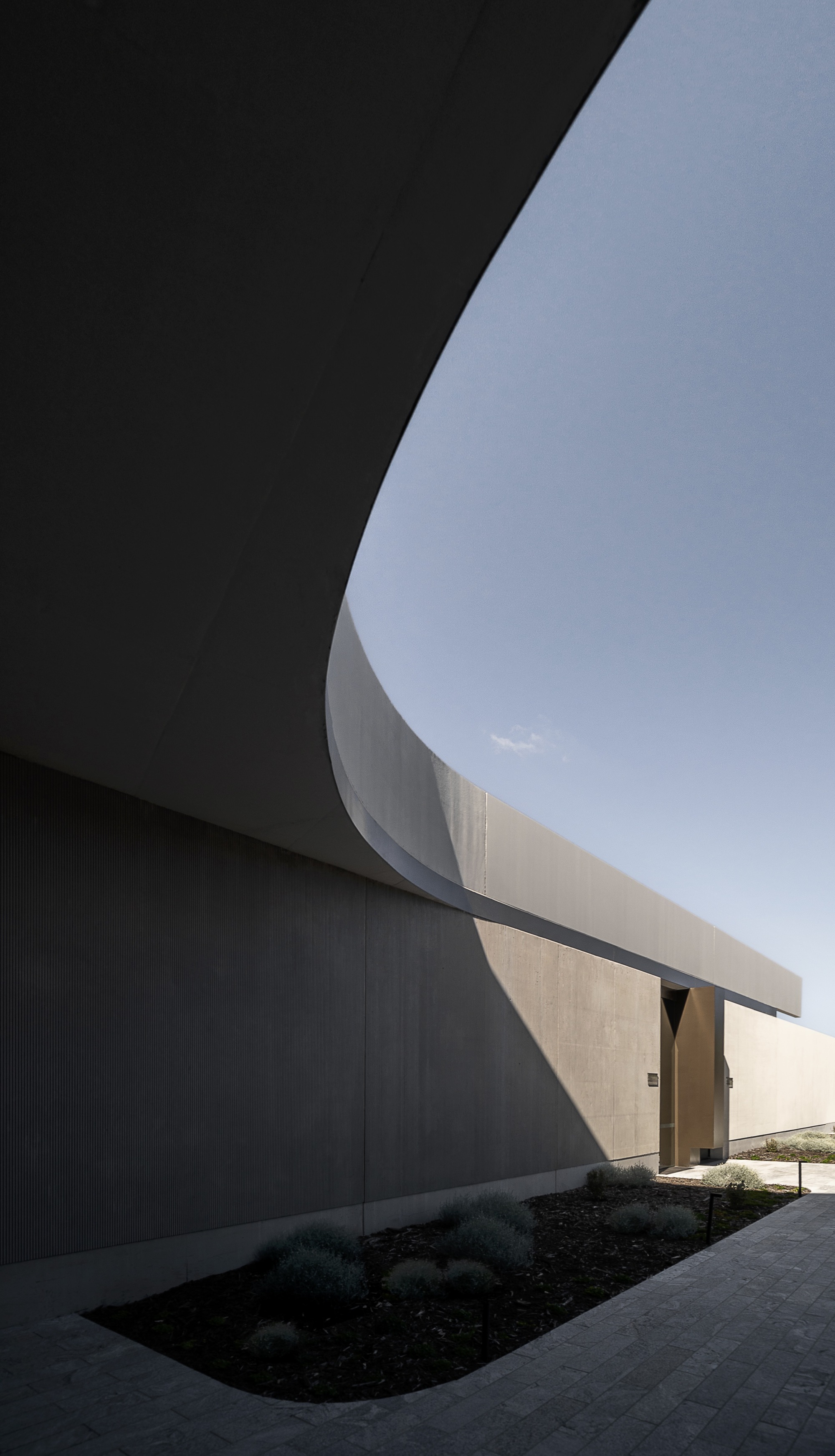 主建築物從地勢的溫和起伏中自然地湧現出來,巧妙地利用了土地的天然落差。建築形態以原始混凝土為主要特色,讓地景有機的感性成為空間的主角,在人造形體與原生環境之間,建立起一種清晰的語言。外牆的帶肋紋理、青銅色玻璃與金屬飾面,為建築增添了穩健性,宛如對自然環境最低限度的介入。圓弧形的混凝土牆體表達了形式的純粹,界定出不同空間,並切割地景,形成了下沉庭院,精準地捕捉了光線與陰影的變化與之對話。