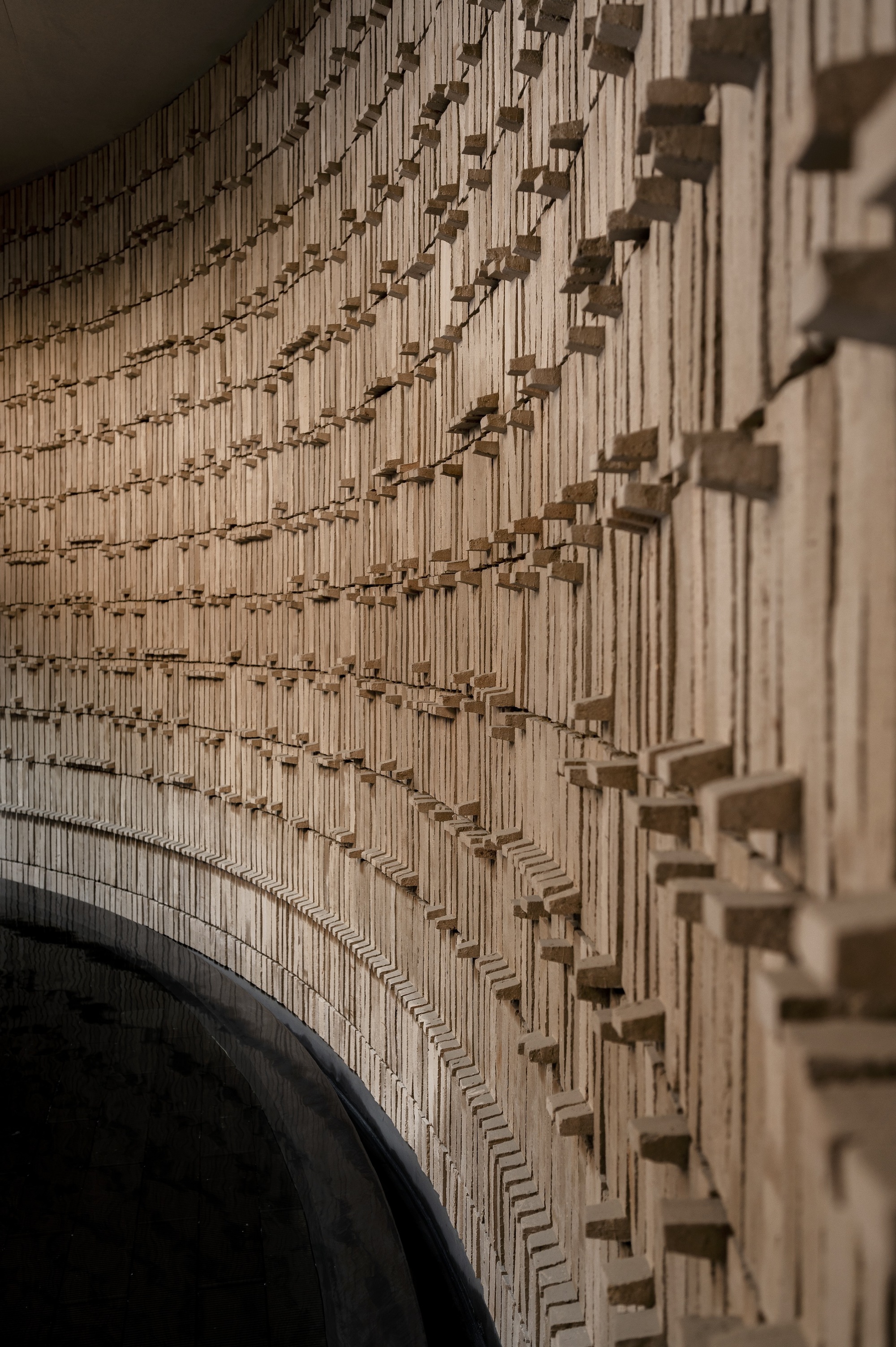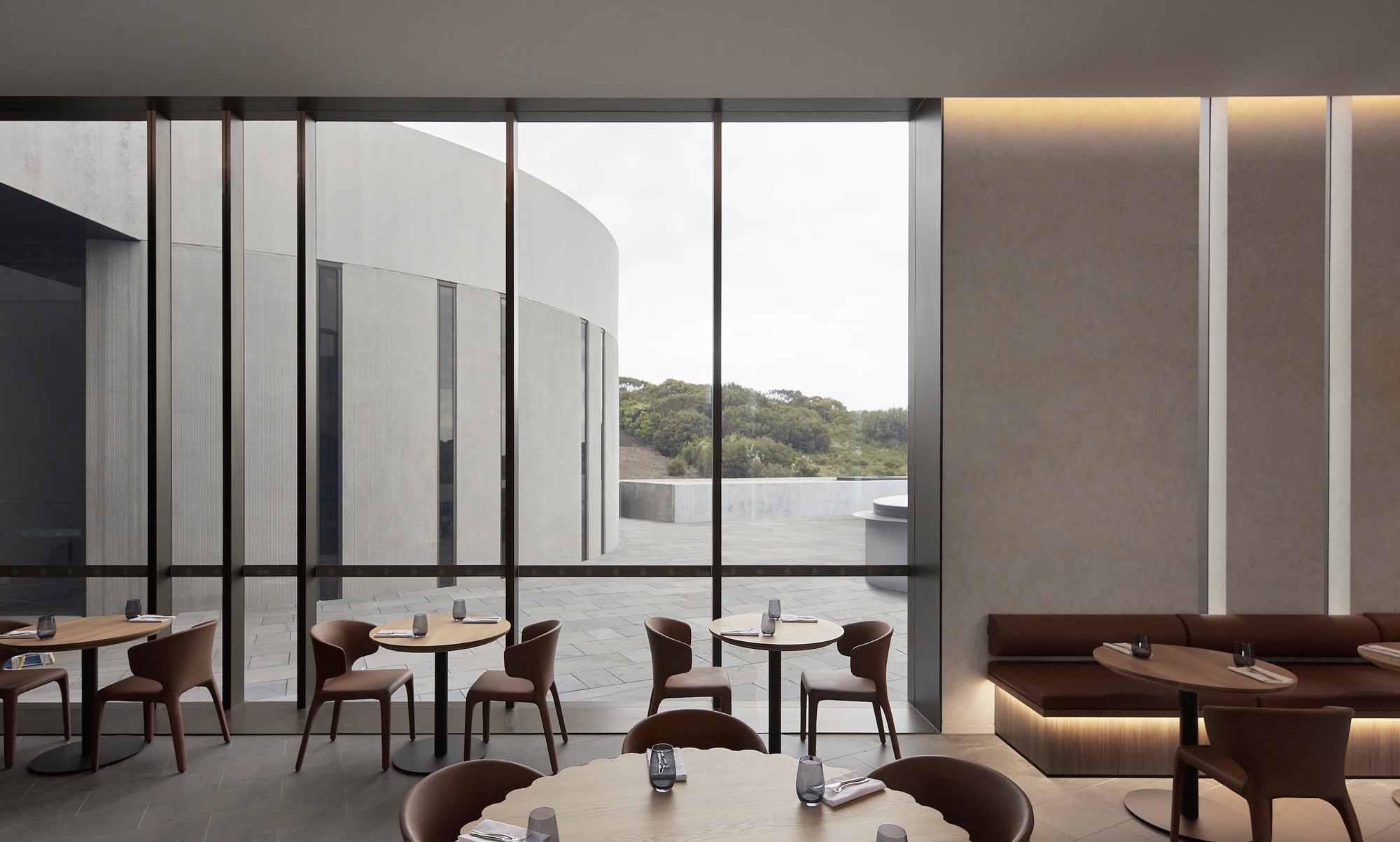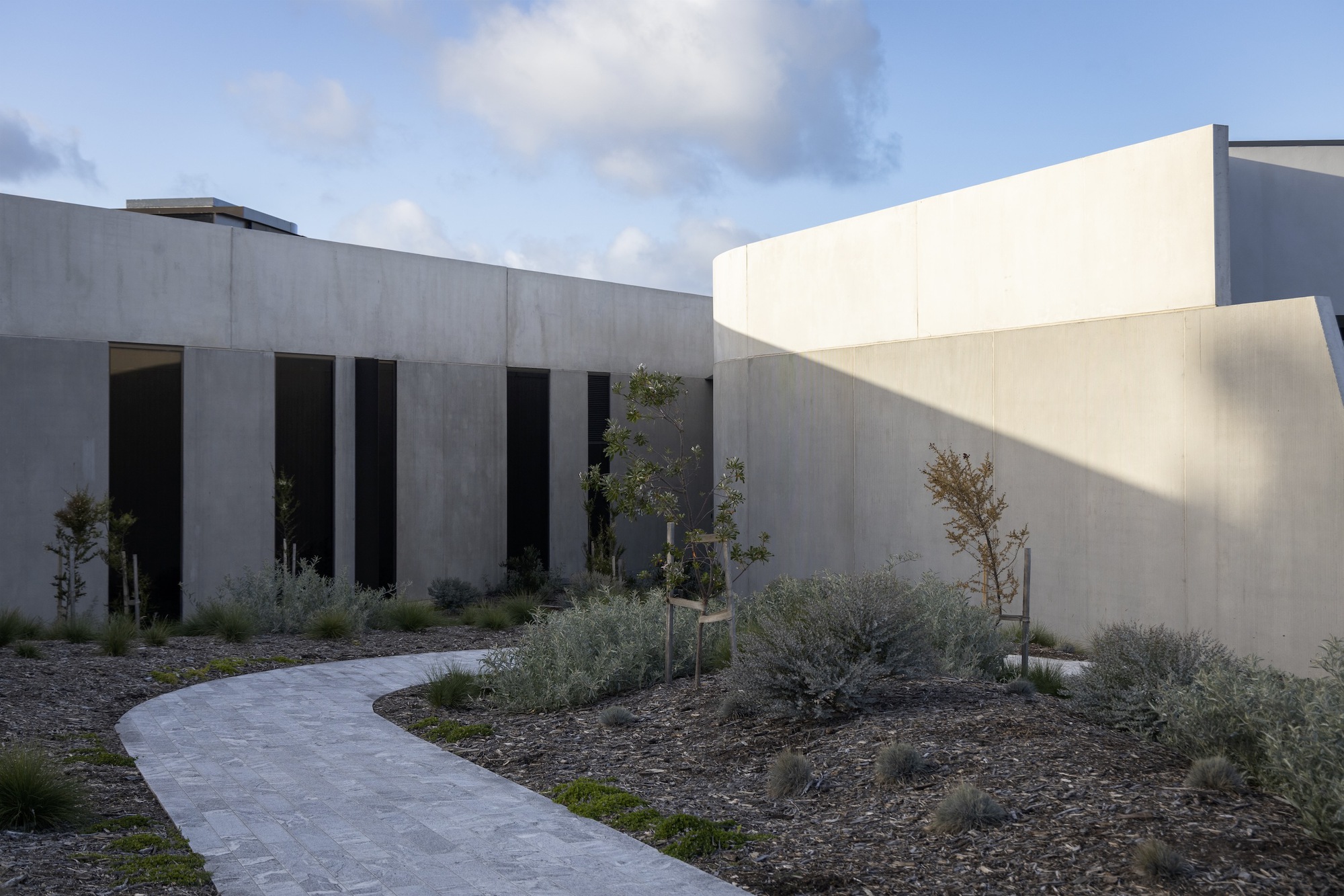 主建築物從地勢的溫和起伏中自然地湧現出來,巧妙地利用了土地的天然落差。建築形態以原始混凝土為主要特色,讓地景有機的感性成為空間的主角,在人造形體與原生環境之間,建立起一種清晰的語言。外牆的帶肋紋理、青銅色玻璃與金屬飾面,為建築增添了穩健性,宛如對自然環境最低限度的介入。圓弧形的混凝土牆體表達了形式的純粹,界定出不同空間,並切割地景,形成了下沉庭院,精準地捕捉了光線與陰影的變化與之對話。