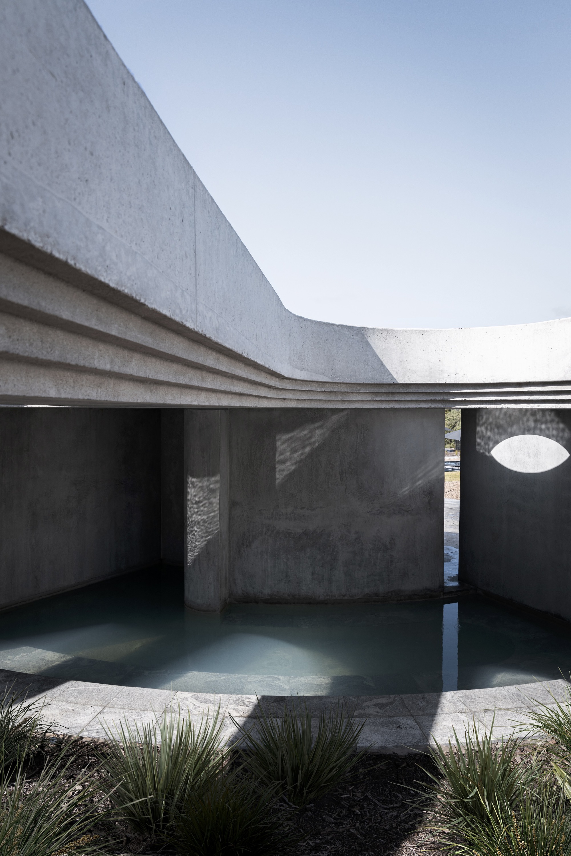 在茶樹灌木叢的沖溝內,隱藏著方正的「植物池」,溫暖石材的直線被斑駁樹影所籠罩。而在山脊之上,淺池設計得低矮,讓使用者得以全身潛入水中,避開海風,在弧形池邊仰望雲朵從海洋迅速飄向海灣的動態,成功捕捉了自然的稍縱即逝的特質。