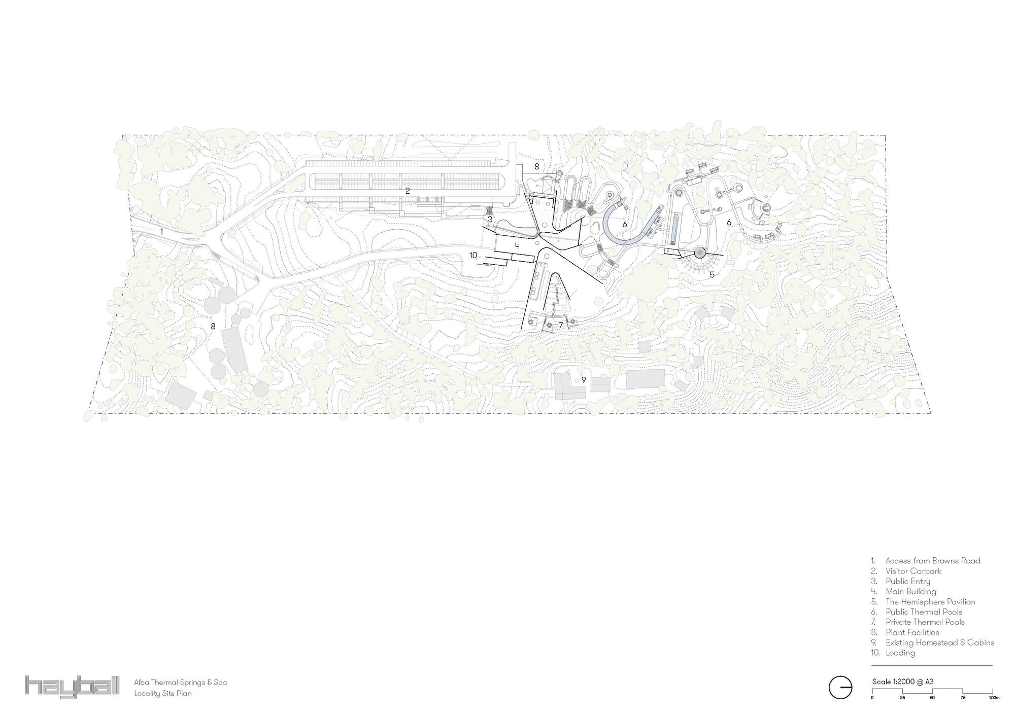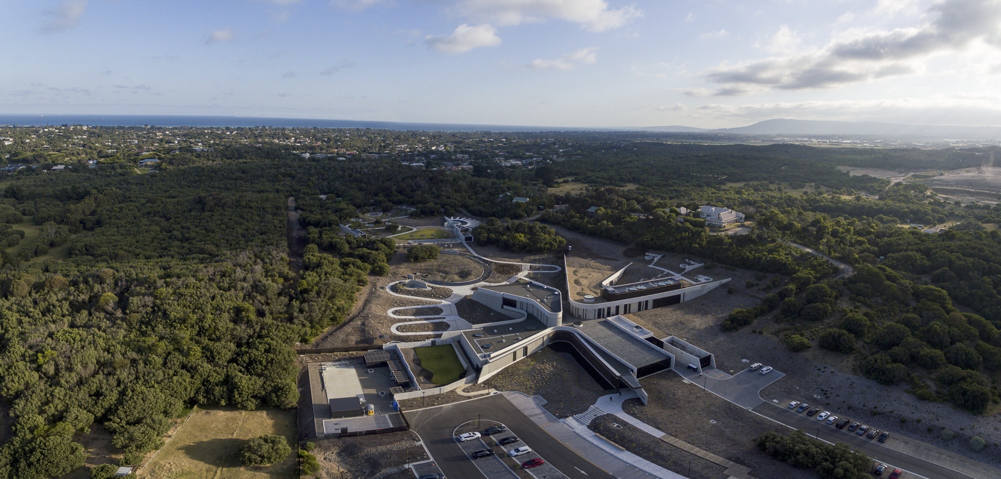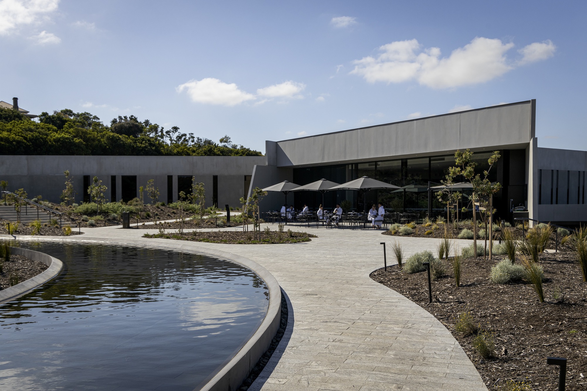 這座溫泉設施將基地過去的綠色楔形地帶,轉化為一座沉浸式的沐浴與健康目的地。莫寧頓半島的獨特原生植被群落與不斷變化的海洋氛圍,為設計提供了豐富的靈感。整個場域涵蓋了三十二座地熱湯池、水景設施與水療建築,全數依偎在當地第三紀沙丘的地景之中,將自然資源的優勢盡顯。