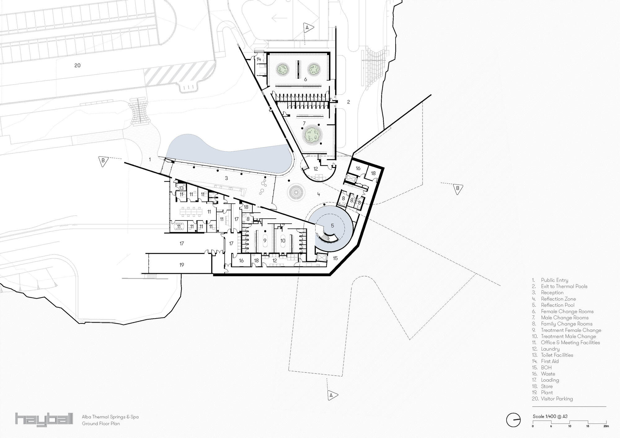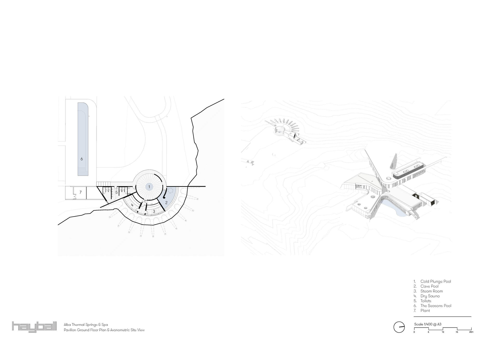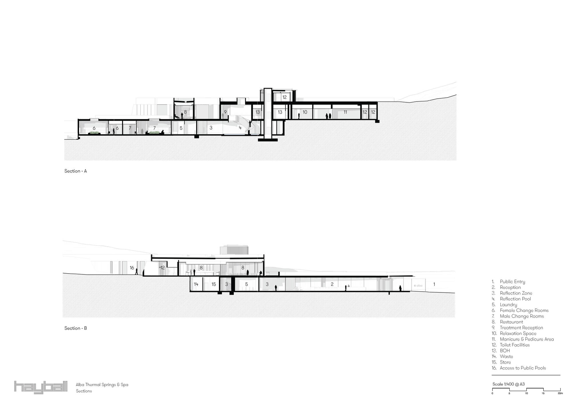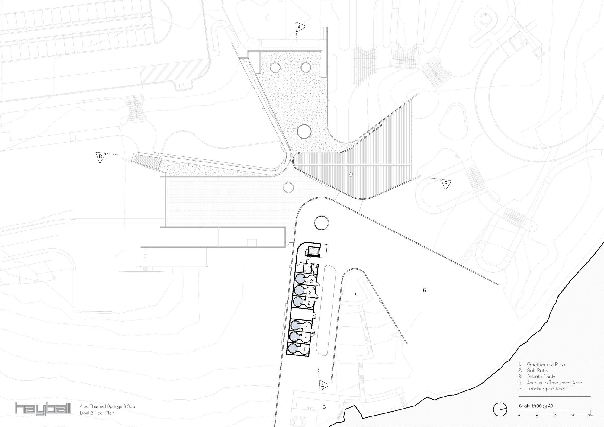 阿爾巴溫泉水療中心的沐浴體驗,圍繞著蜿蜒的石徑展開。所有三十二座湯池皆遵循簡單的幾何形式,這不僅有助於訪客直覺式尋路,確保沐浴體驗的公平性,同時也提升了營運效率。湯池的設計雖然形式簡潔、細節精確,但選址至關重要,每一座湯池都經過審慎規劃,考慮地形、景觀、植被、季節乃至微氣候的相互作用。這種意識形態的選址,確保了在同一個水療設施內,訪客能體驗到一系列豐富且獨特的感官旅程,遠遠超乎傳統溫泉的單一感受。