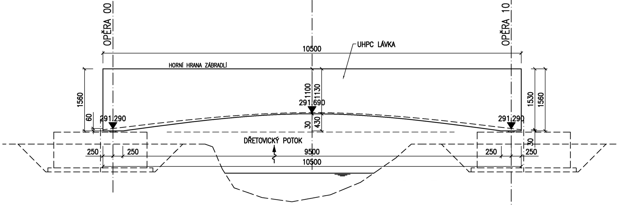 這座橋樑的設計特徵在於其極致的輕盈與細緻。為了實現這種視覺上的輕量化,同時確保結構在面對溪流洪水時的穩固性,設計團隊採用在工廠裡以預鑄超高性能混凝土(Ultra-High Performance Concrete, UHPC)製作這個構造物。