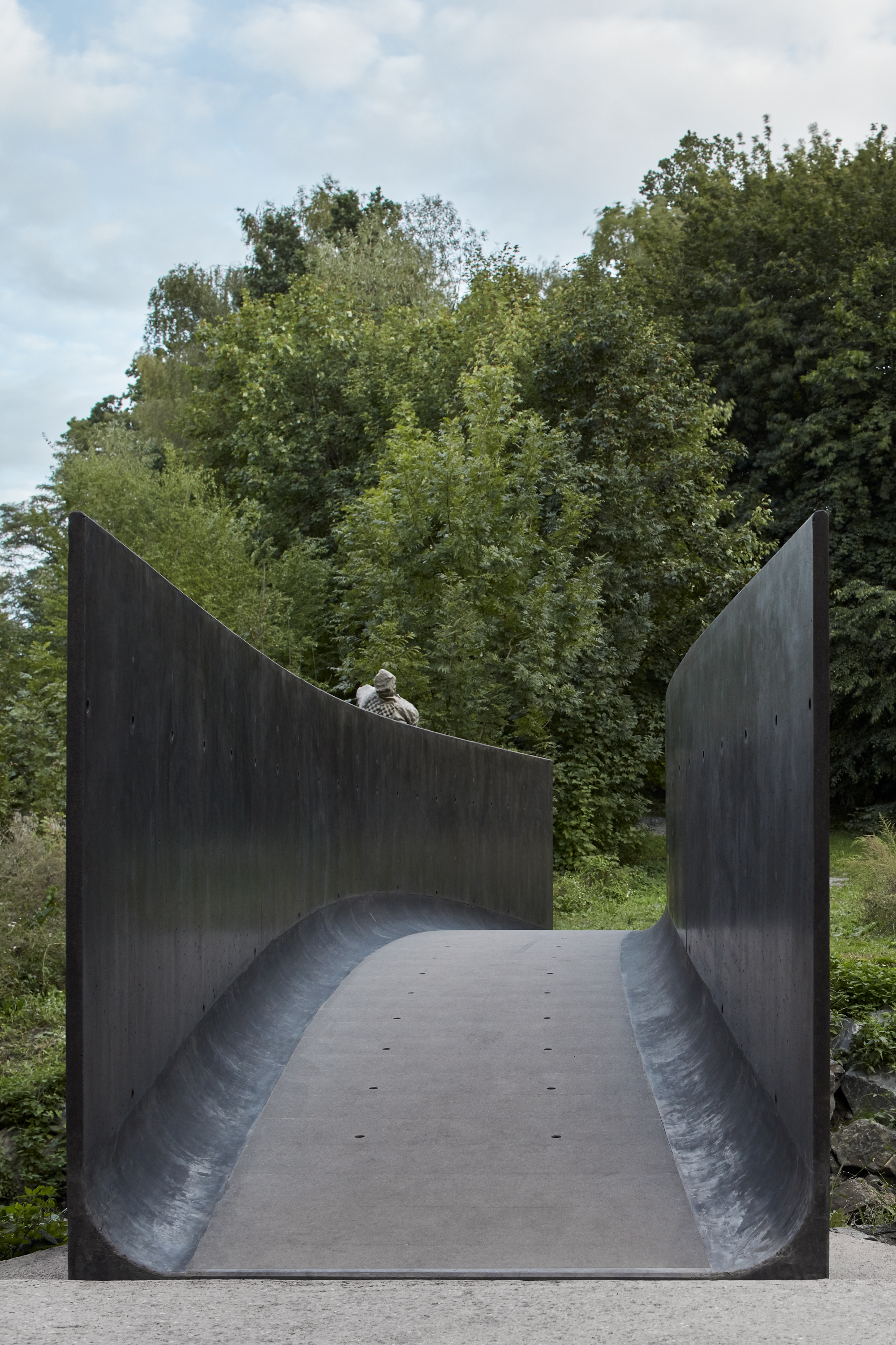 不僅是連接村莊與附近墓園的物理通道,更被賦予了深層的精神意涵——作為「生者世界與死者世界」之間的門戶。為了呼應這個莊嚴的主題,建築師選擇了黑色作為橋樑的主色調,這在自然景觀中既顯得肅穆,又帶有一種超脫的神秘感。黑色的混凝土表面吸收了光線,使得體在視覺上消融於周遭的景色之中,彷彿一道通往彼岸的幽暗路徑,引導著行人在穿越溪流的同時,也經歷一場心靈的沉澱與過渡。