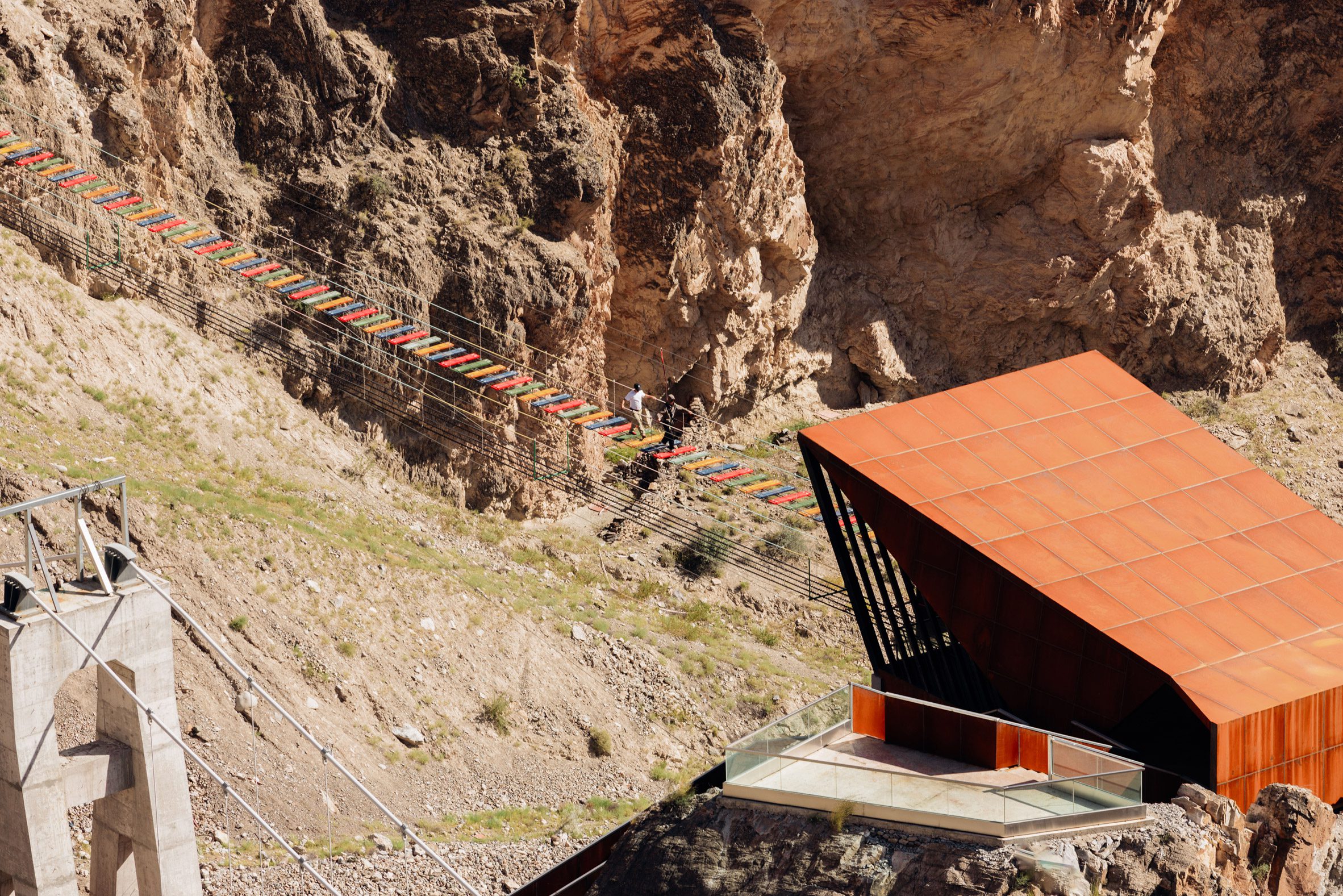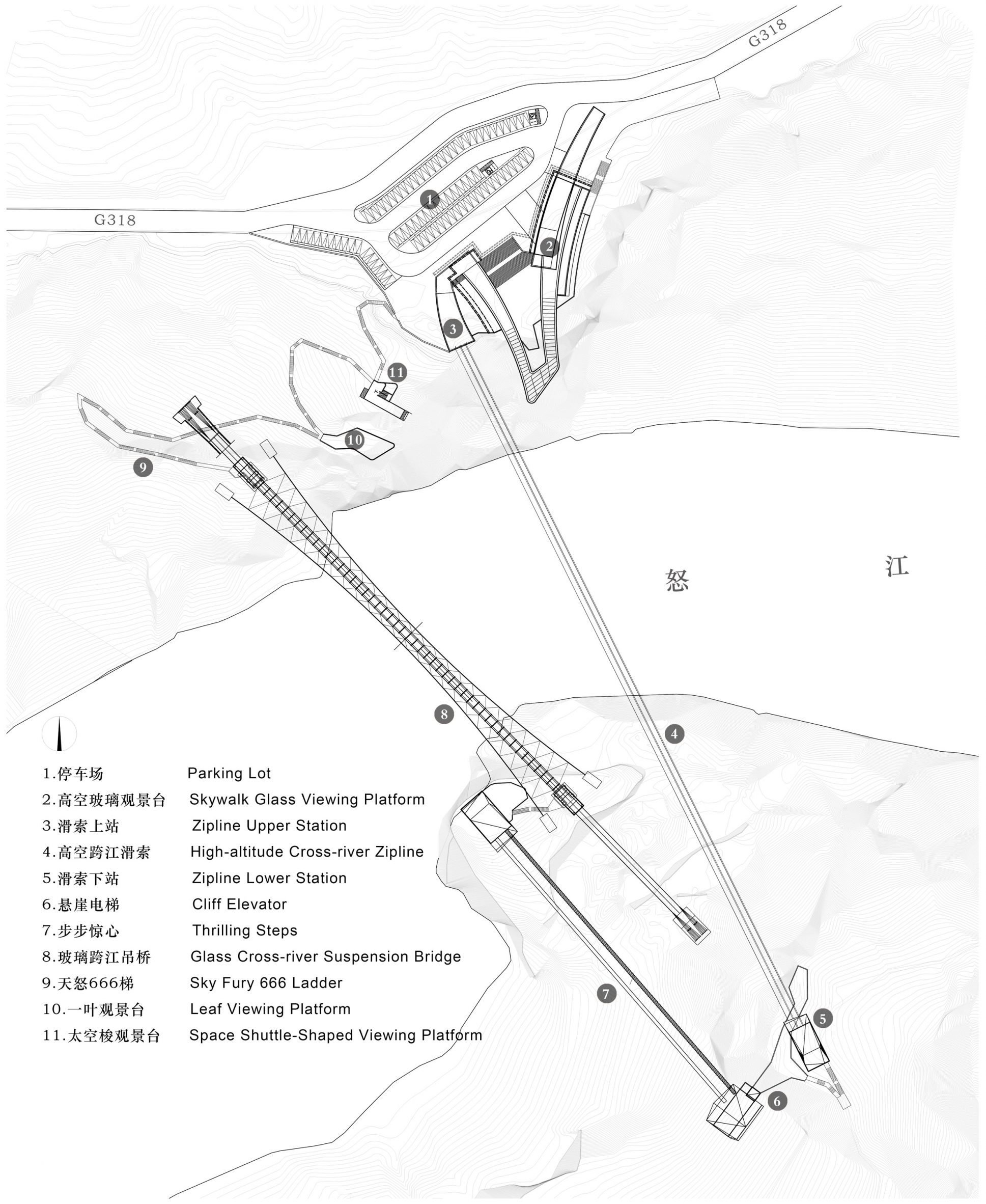 Archermit將這片險惡的峽谷轉化為一座立體的冒險樂園。遊客體驗從北岸的遊客中心開始,沿著蜿蜒的耐候鋼步道,串聯起不同造型的觀景點:一個靈感來自「太空艙」,另一個則模仿「樹葉」形態。跨越怒江的設施同樣精彩,除了刺激的高空滑索外,還有一座白色的鋼構懸索,同樣鋪設了玻璃步道,取代了舊有的危