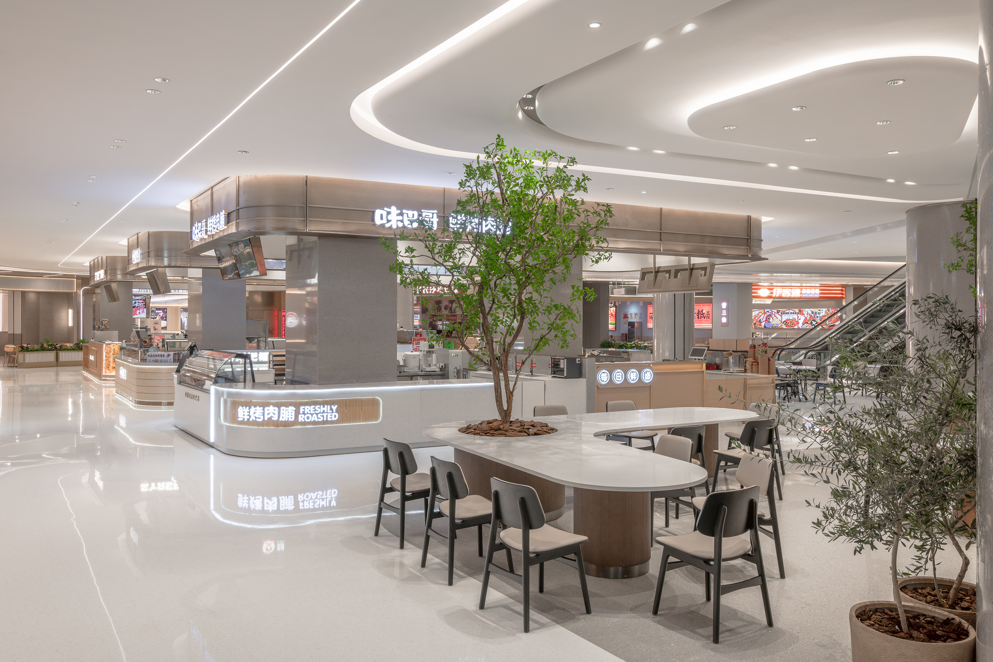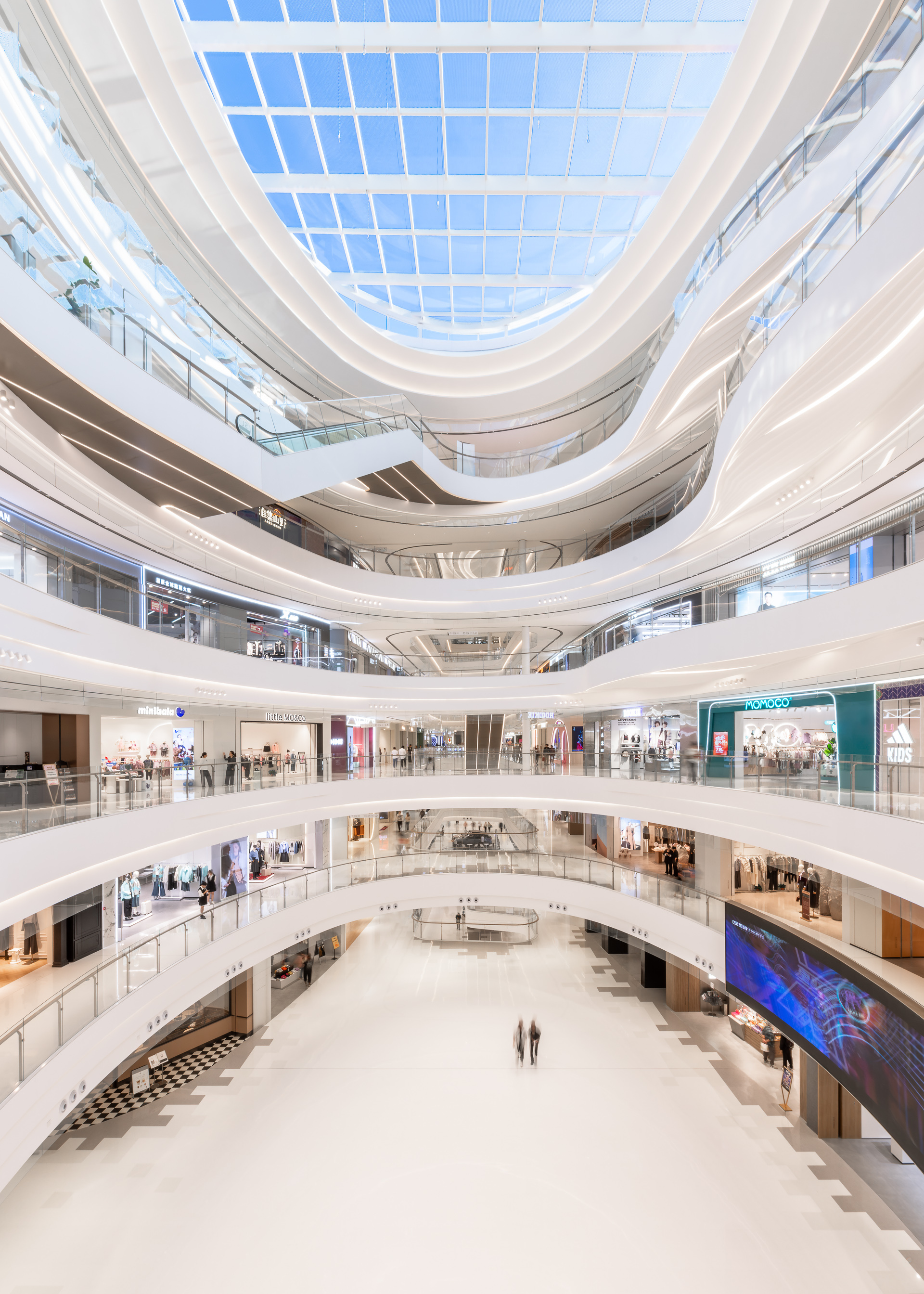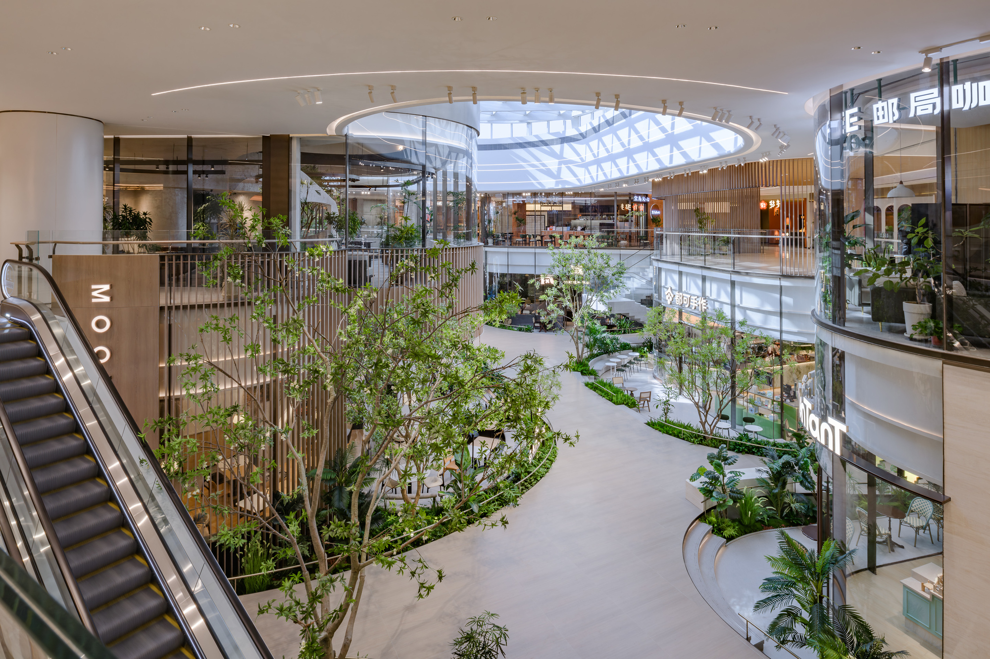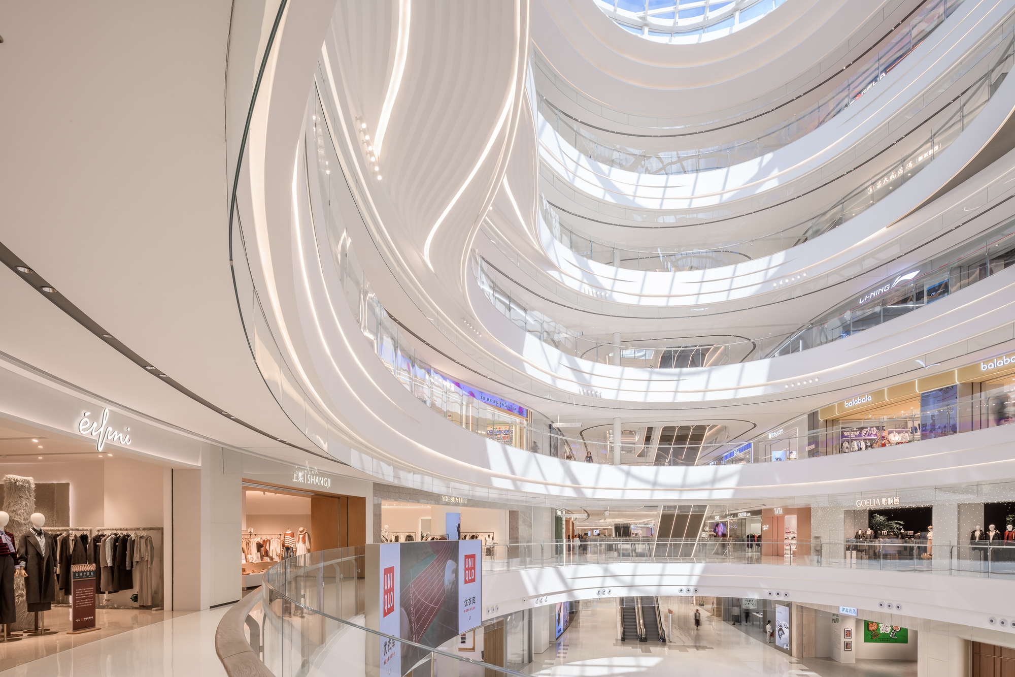 申俊偉將橫向延展近三百米的巨大內部空間,視為一條流動的河流。提取水流的蜿蜒、山林的起伏等元素,轉化為室內天花、地坪與立面的造型語彙。曲折、扭動的線條不僅消弭了長型空間的單調感,更構築出一道道流動的視覺風景,讓遊逛其中的消費者彷彿置身於流淌的水韻之中,體驗到一種「步移景異」的園林趣味。