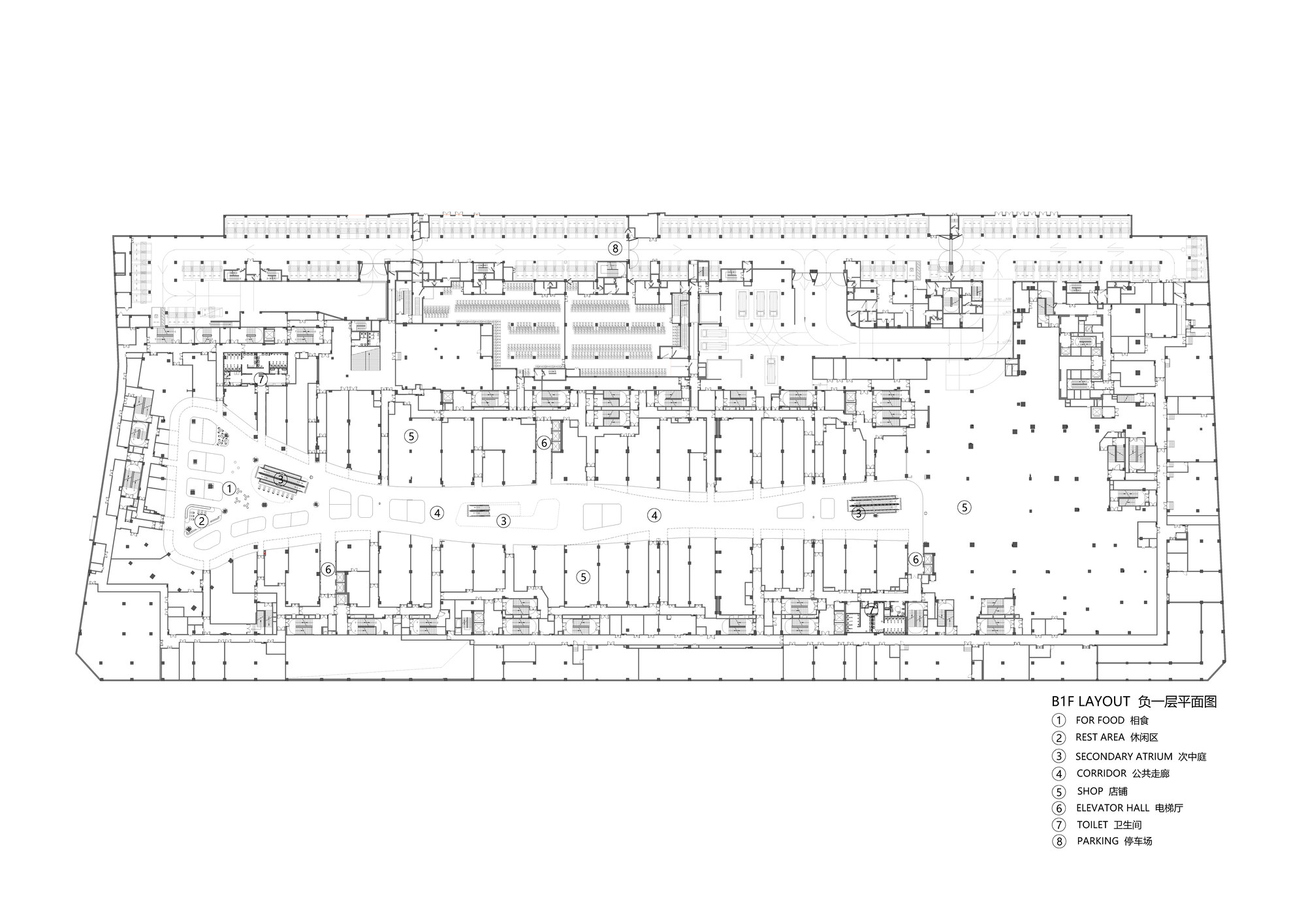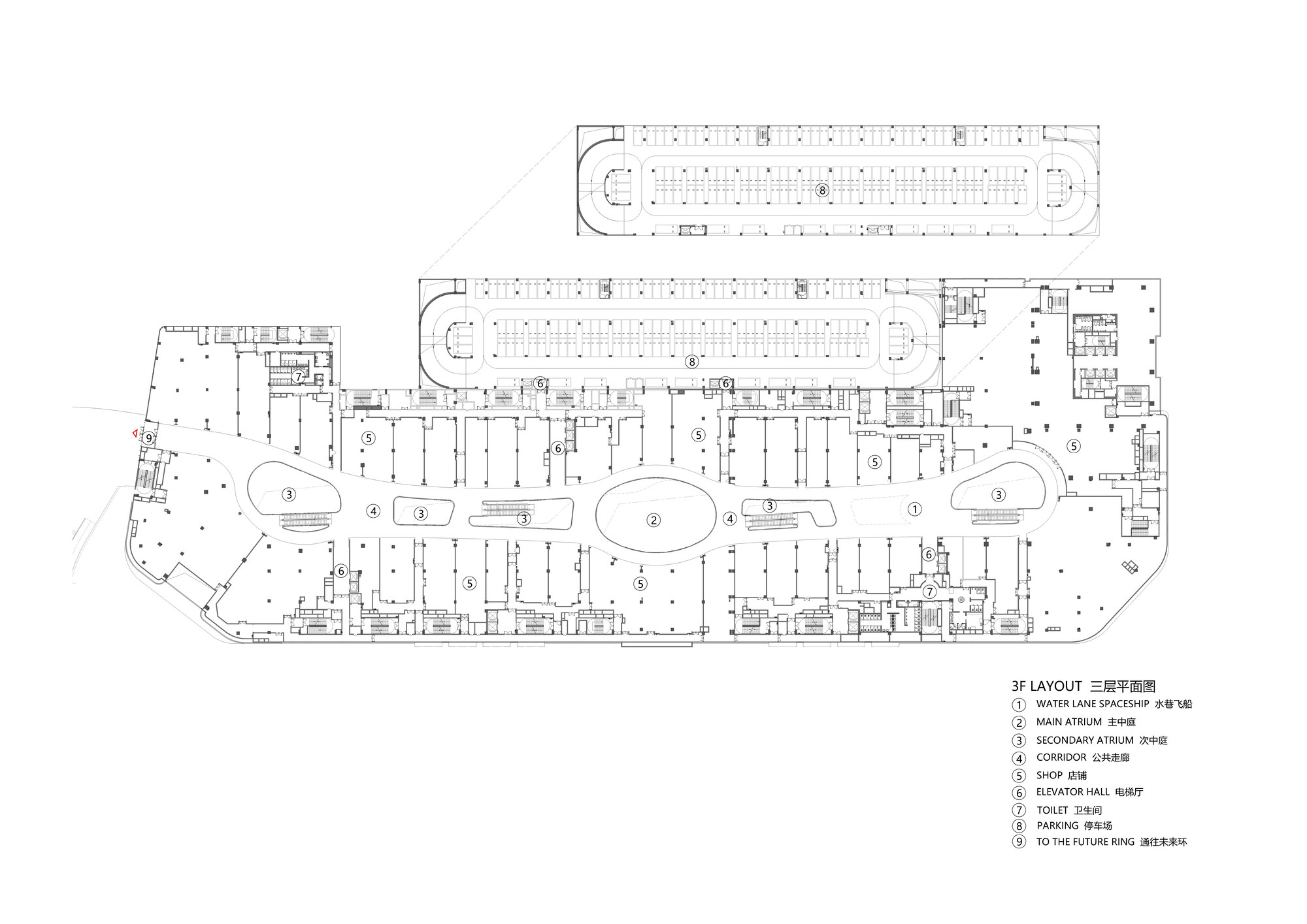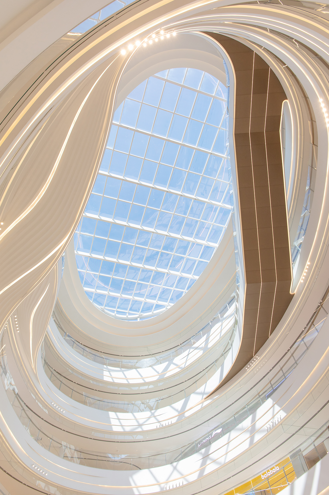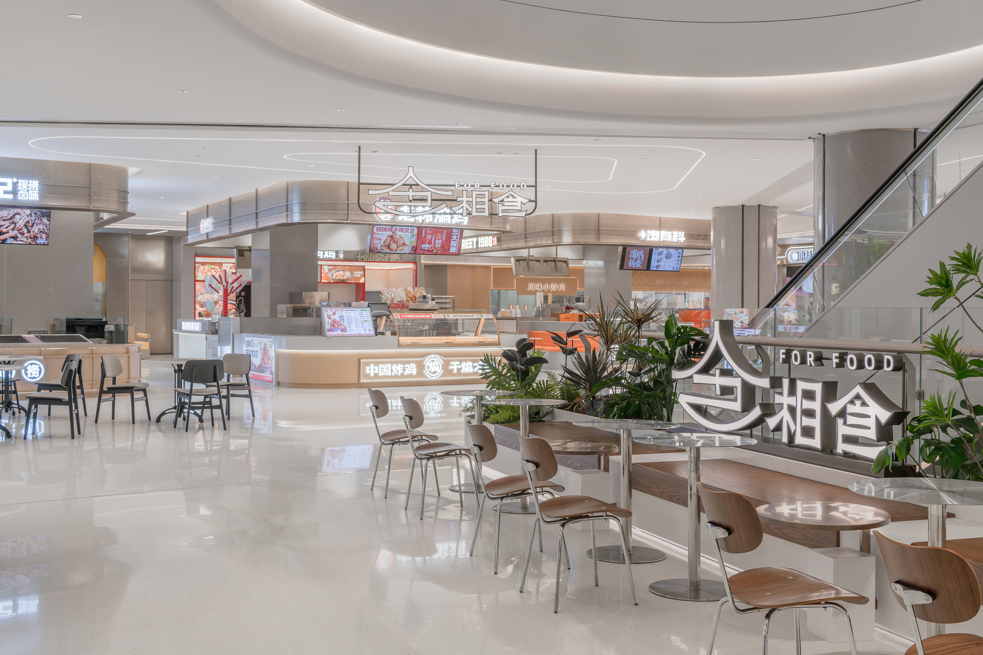 申俊偉將橫向延展近三百米的巨大內部空間,視為一條流動的河流。提取水流的蜿蜒、山林的起伏等元素,轉化為室內天花、地坪與立面的造型語彙。曲折、扭動的線條不僅消弭了長型空間的單調感,更構築出一道道流動的視覺風景,讓遊逛其中的消費者彷彿置身於流淌的水韻之中,體驗到一種「步移景異」的園林趣味。