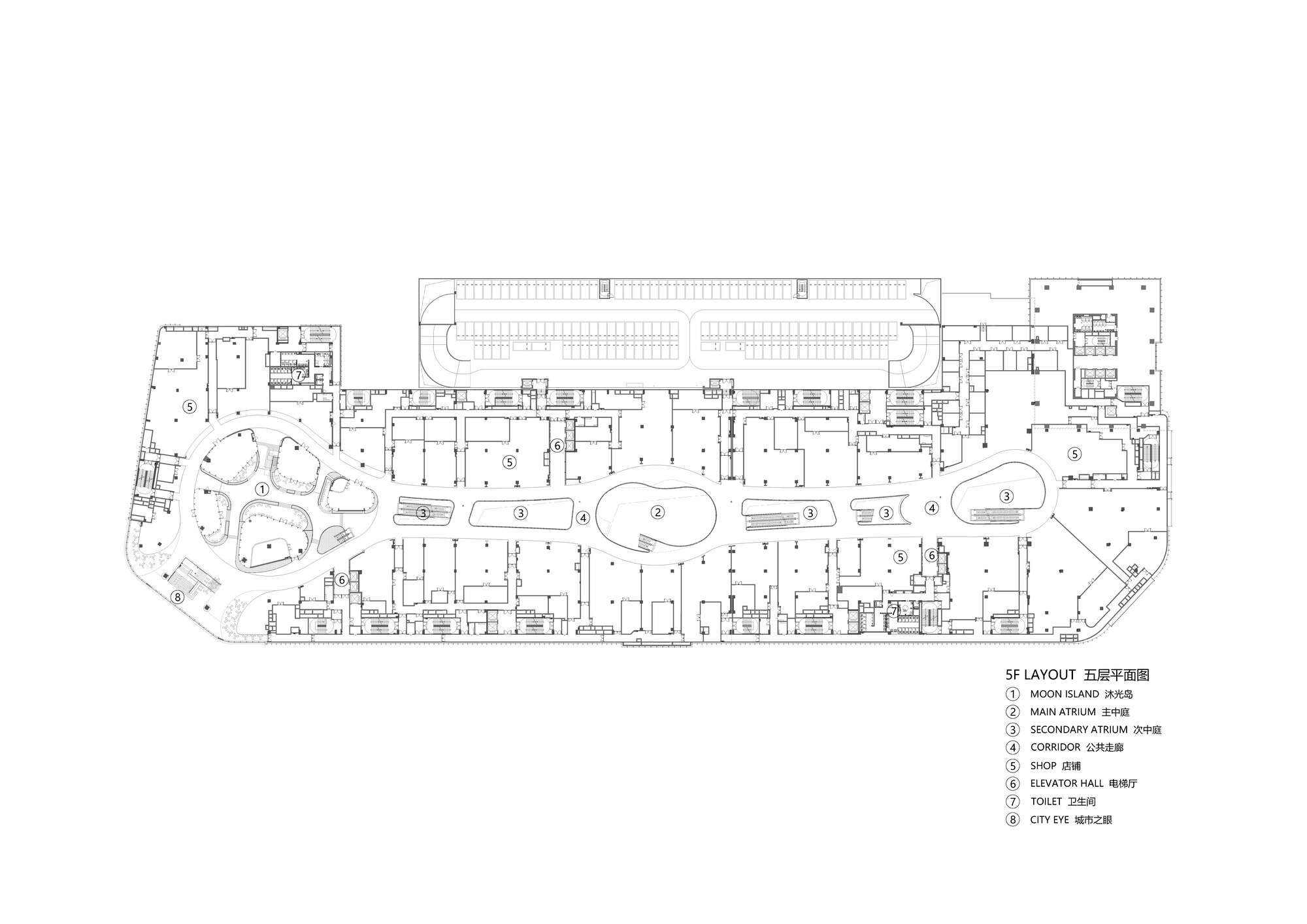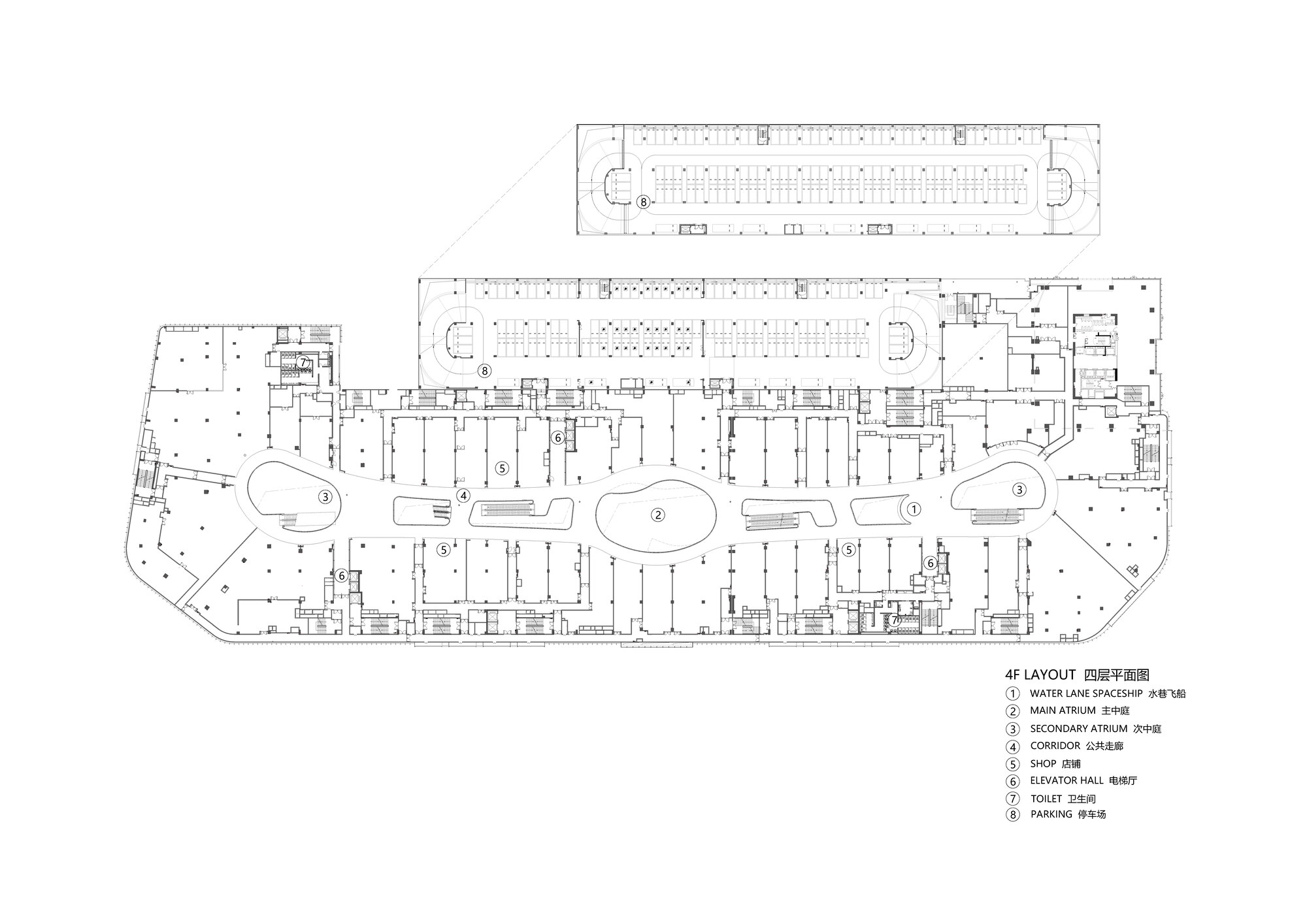 為了強化空間的記憶點與遊逛的豐富度,設計團隊將七個商業樓層劃分為四大主題空間。除了前述的「沐光島」外,「水韻T台」利用挑空優勢創造出時尚展演的舞台感;「水巷飛船」則帶入科技與未來的想像,吸引年輕族群;「相食」則專注於餐飲體驗的營造。這些主題空間並非獨立存在,而是透過環形動線有機串聯。業態組合與共享場景被巧妙融入其中,形成鮮明的視覺衝擊力。這種分區策略不僅有助於人流的引導與分散,更讓不同客群都能找到屬於自己的舒適角落,展現了商業空間設計的細膩度。