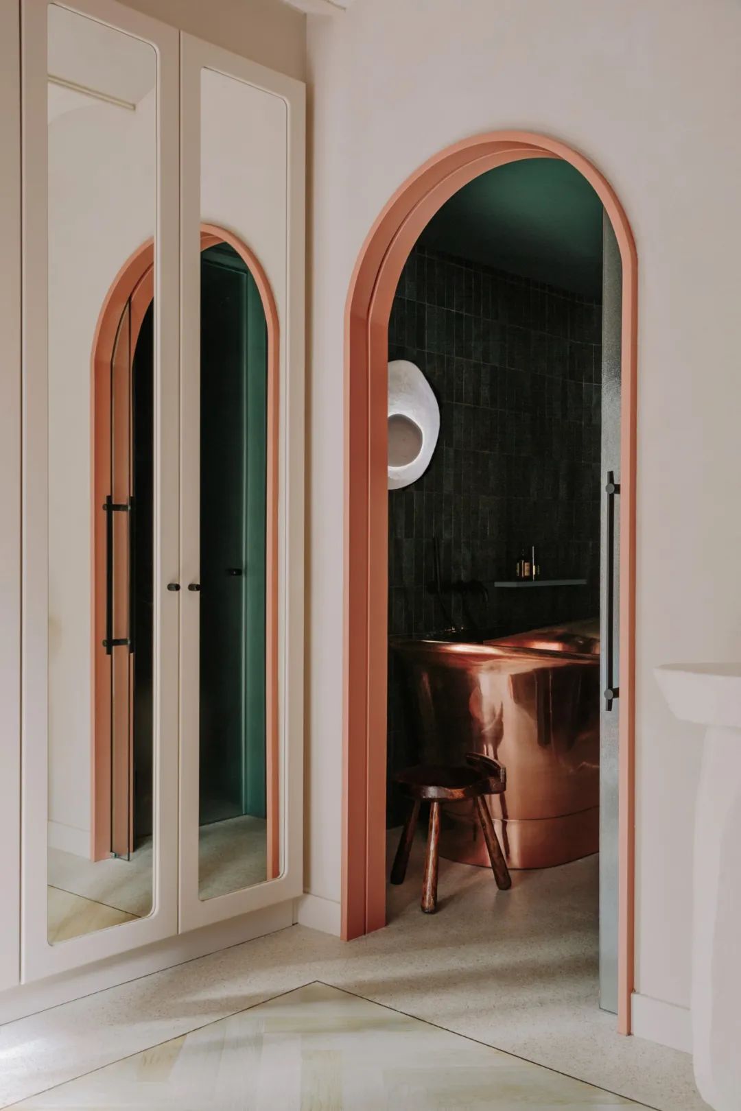 浴室採用不同的技巧,靈感來自大海的涼爽色調。牆壁和天花板閃爍著藍綠色陶瓷的光芒,而獨立的銅浴缸在神秘的黑暗中閃閃發光,就像一條金色的魚,私密的深色內飾代表著向私人區域的顯著過渡。壁燈由Szymon Keller與Crea-Re Studio合作設計,由papier-mâché製作,象徵著月亮的突出之處,因為從海洋深處看到它是變形的。