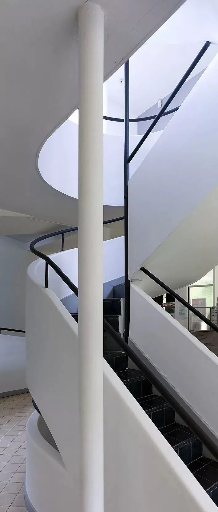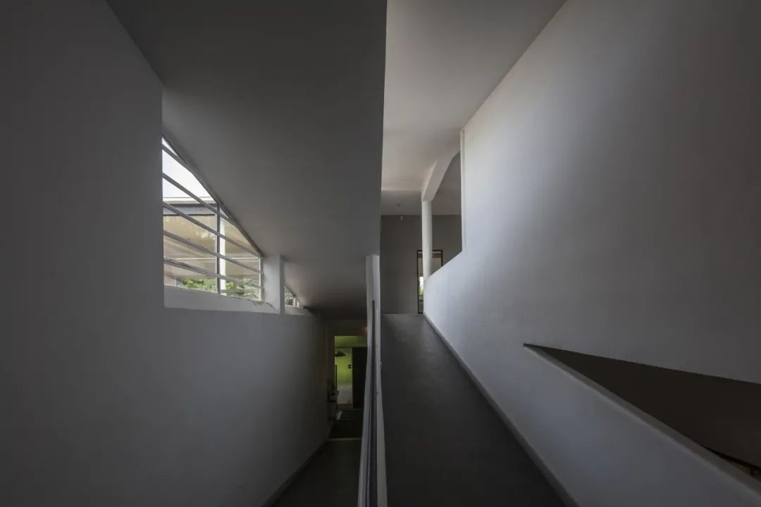 這一簡潔的秩序被連續而頻繁的要素所拆解:包括一座雕塑性的樓梯、在內院上方呈三角形的開啟、坡道的不對稱性、光線,牆體的偏轉。三層的空間環繞內院佈置,內院完美的為三層提供日照。另一方面,軸向的坡道抑制了不穩定的空間感,這些坡道在外部再次出現且通向露台,強烈的流線被包含於牆體華麗的弧線,彷彿被擁抱其中。