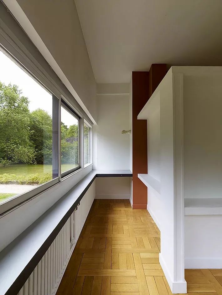 緊鄰道路、被一道牆體半遮半掩的門房預示了還未看到的建築的語言風格,一條巧妙佈置的通路隔開了兩幢建築,二者完美並完全地相互聯絡,就像這是一塊小的巴黎地圖一樣,柯比意完全佔領了空間:房子是這一空間的一個細節。
