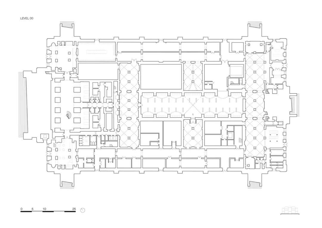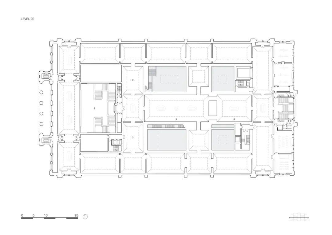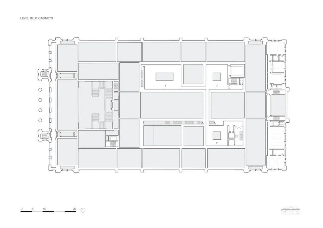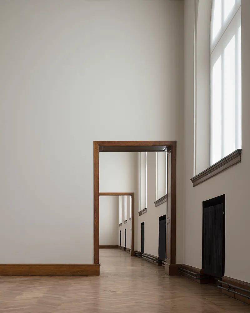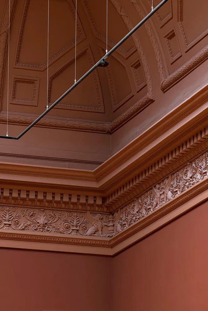 整修後歷史空間的展覽室圍牆以深粉紅色、綠色和紅色為基調,搭配橡木門、高大立柱和石膏裝飾的天花板,以共同營造出一種古老而又宏偉的環境氛圍。進行空間改造時仔細研究並參考了美術館最初的用色方案。博物館一層的巨大開窗,在保證內部採光的同時,還給訪客提供絕佳的室內觀景空間。該美術館核心層配備的是寬大的玻璃頂棚,空間內還設有供人休息的舒適沙發。