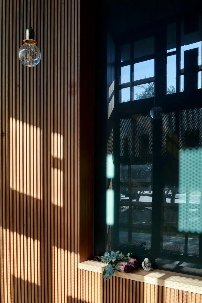 每個家族墓群都包含了額外的前院景觀,配以混凝土頂棚和青石鋪面,以做集會空間;特別訂製圖案的陽極氧化鋁格柵更是滿足了空間的私密性需求。教堂外牆的設計,使用的是玫瑰色的澳洲花崗石格柵窗,以柔化混凝土和石材給人的堅硬冰冷感,搭配使用柏木鑲板,教堂空間散發著溫暖和親密的光彩。