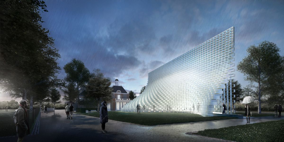 位於英國倫敦的蛇形藝廊(Serpentine Gallery)從 2000 年開始,每年都會邀請世界知名且尚未在英國建造過永久性建築的設計師,來為其設計夏季主體館,2016年時受邀的丹麥BIG建築師事務所設計的蛇形藝廊戶外展覽亭,呈現一座「拉開的牆」的模樣,從直線變化成一個三度空間,這個與眾不同的建築在白天是一家咖啡店,到了晚上則會變成活動空間,匯聚著藝術家、作家和音樂家。