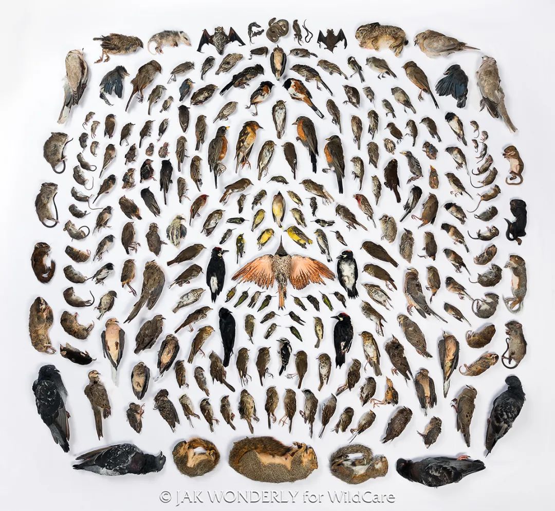據統計,在美國每年有約20億隻鳥類和其他野生動物被家貓殺害,在鳥類非自然的死亡原因中,被貓殺死幾乎佔了四分之三,遠超過建築物、汽車撞擊之類的原因。美國攝影師 Jak Wonderly 與加州一家非營利性動物醫院合作,收集因家貓傷害而死亡的動物屍體,冷凍保存,一年內共收集到232只,最後將它們解凍、修繕後拍攝