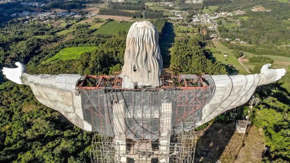巴西南部城市 Encantado 正在建造一座新的基督雕像,建成後連同底座高43米,將超過里約熱內盧那座。主體結構建造開始於2019年,上週安裝了頭部和手臂部分。整個項目耗資35萬美元,主要來自企業和個人募款