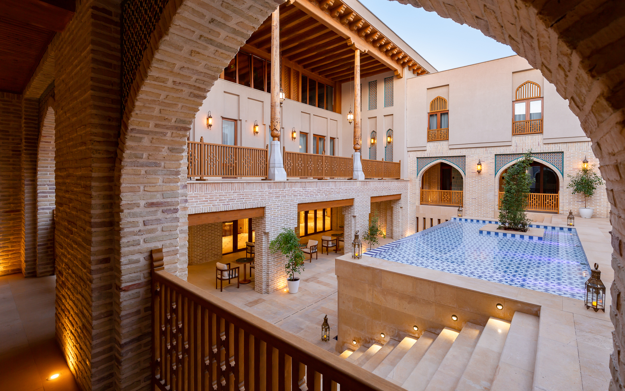 建築內部包含數個庭院。第一座庭院作為接待大廳使用,其設計仿效布哈拉的室內商店街,營造出熱鬧的商業氛圍。主庭院則採用住宅建築的格局,設有風塔與一座小噴泉,在炎熱的夏季,能有效調節微氣候,提供舒適的休憩空間。此外,尚有數個小型庭院,為角落的房間與走廊引入自然光線,改善室內採光。多重庭院的設計,豐富了空間層次感,更創造出宜人的微氣候,足見設計者對於細節的用心。