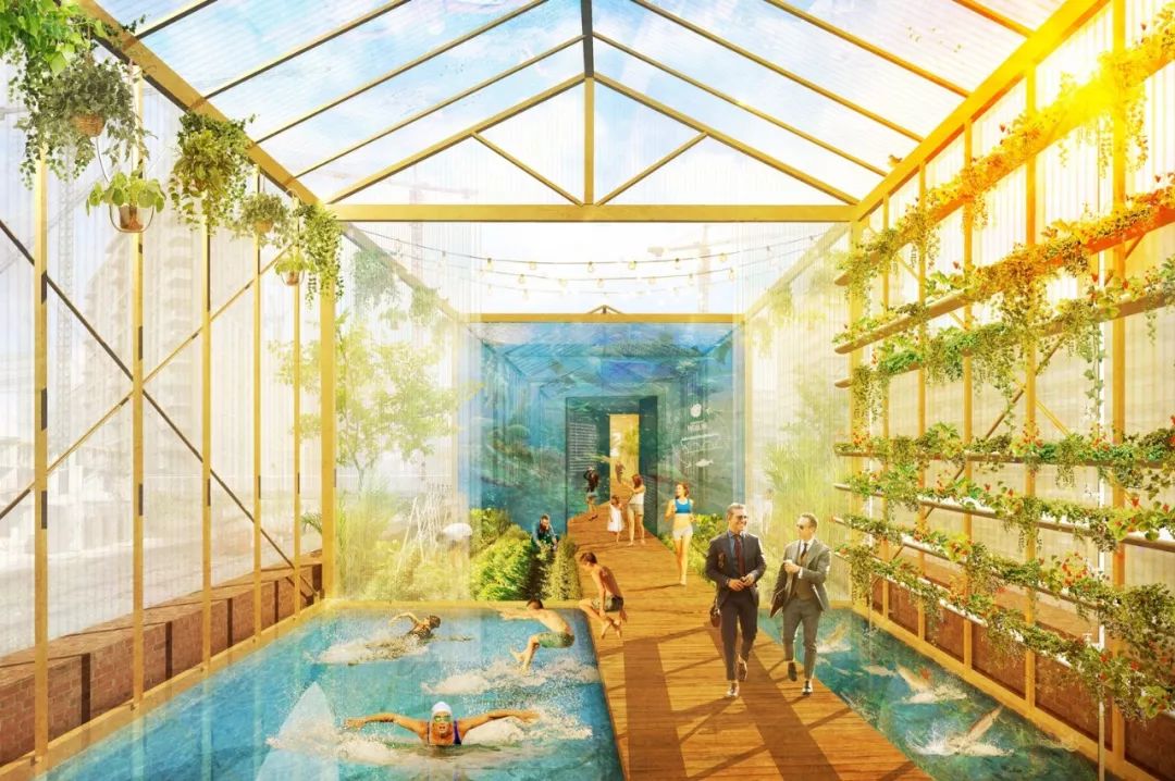 倫敦廢棄高架再利用 Hammersmith Highline 競圖,德國bauchplan建築師事務所以魚菜共生和游泳池打造都市高架公園