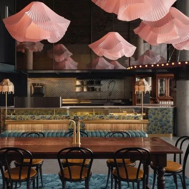 設計從英國攝影師德沃德•邁布里奇(Eadweard James Muybridge)著名的定格鏡頭中汲取靈感,設置了一系列客製化的芭蕾舞裙燈,這些吊燈在空間中流轉,為空間賦予了更加親人的尺度。每件燈罩上的「芭蕾舞襯裙」都有著細微的差別,進而產生出一種飄渺的靈動之感。黑色胡桃木製成的高腳桌看似突兀,實則增強了空間中「遊戲」與「律動」的主題,將「社交舞蹈」的靈魂注入到空間的本質中。