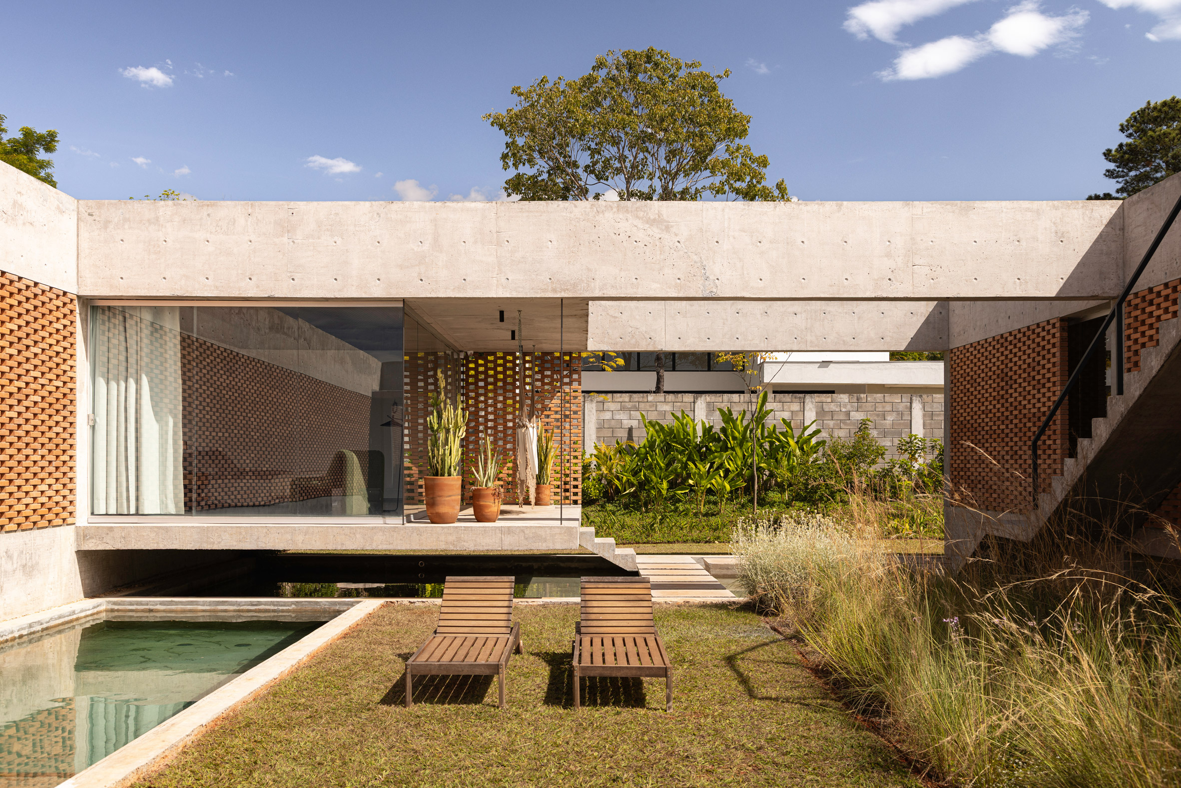 距離巴西利亞(Brasília)二十公里的高級封閉社區內,矗立著四百二十平方公尺的圖平住宅(Casa Tupin)。主導設計的 巴西建築師事務所 Bloco Arquitetos,深諳首都特殊的氣候特性與都市紋理。有別於傳統封閉格局或過度依賴空調的現代豪宅,團隊規劃大型中央庭院作為休閒中心與連結樞紐,使室內外空間緊密串聯。