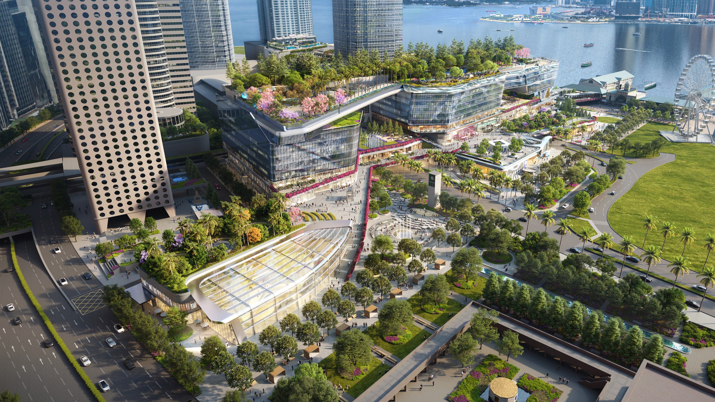 設計核心圍繞著「橋」的概念,意圖透過建築實體,將長期被道路切割的中環腹地與海濱長廊重新連接。透過一系列錯落有致、邊緣柔和的玻璃量體,搭配架空的綠化步道,建築師們在喧囂的都會中心創造出一條生態走廊。親生物的設計語彙,讓建築不再是冰冷的水泥盒子,而是會呼吸的有機體,讓行人在穿梭其間時,能感受到自然光影與海風的流動。