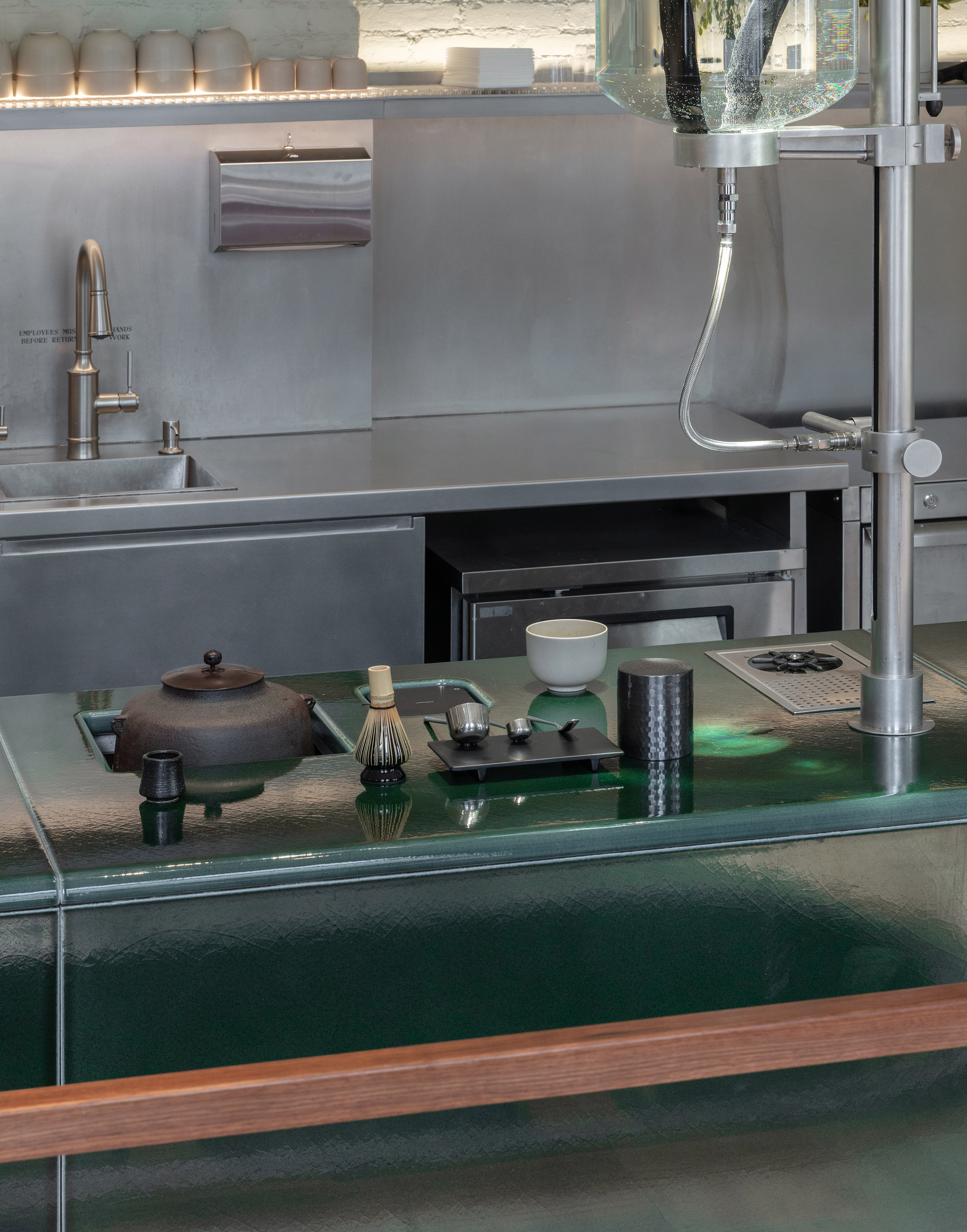 備長炭的多孔質結構能有效吸附雜質,同時釋放礦物質,平衡水質的酸鹼值,用以沖泡抹茶,更能引出茶湯的甘醇。建築師將淨水這個幕後準備工作,轉化為一場公開的視覺儀式,不僅彰顯品牌對品質的吹毛求疵,更成為一種強而有力的品牌敘事。
