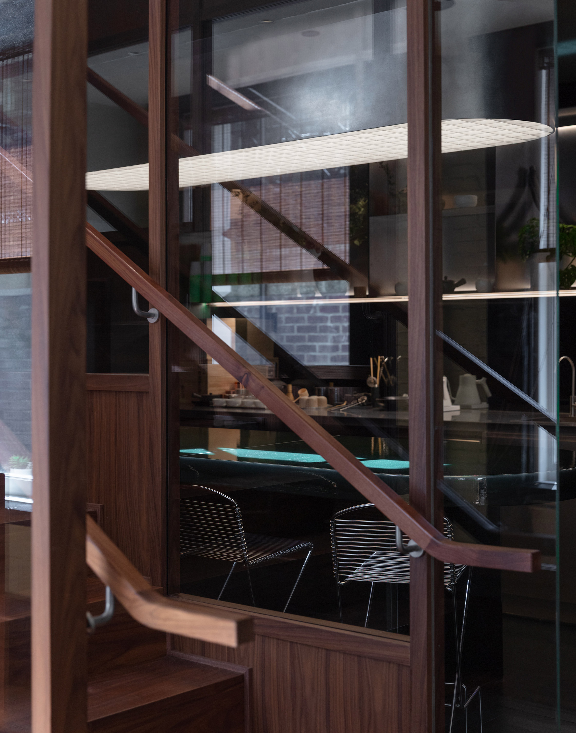地下一隅,一座由玻璃圍起的品鑑室,被貝納爾形容為「一部分是實驗室,一部分是聖殿」。這處半開放的空間,讓品茶或研發的專注姿態,化為公共休憩區一道靜態的風景。設計團隊在與業主及品牌顧問公司Base Design參訪日本後,對當地茶園中光線篩過樹葉的樣態念念不忘。那種被過濾後的柔和光暈,啟發他們為店面的所有窗戶裝上百葉簾。此舉成功地在車水馬龍的曼哈頓中心,複製出那份令人心安的靜謐光感,為整趟品牌體驗,畫下一個餘韻悠長的句點。