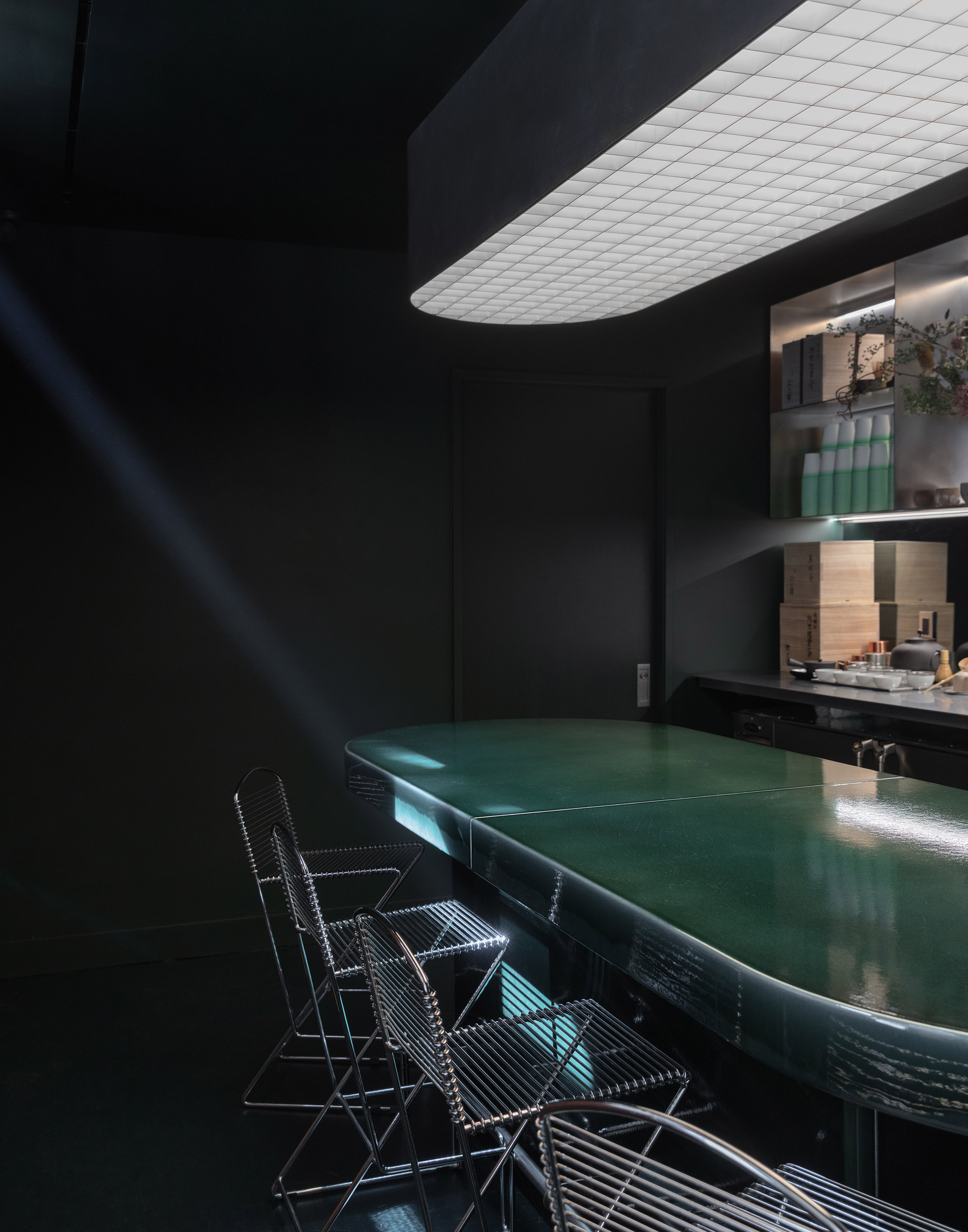 空間的牆面,鋪上帶有淡綠色澤的特殊陶土,觸感溫潤,視覺上給人一種安穩踏實之感。選用這種材質,意在捕捉抹茶粉末那種既絲滑又帶點神祕的質地。建築師團隊深知,一個成功的商業空間,販售的不只是商品,而是一種經驗、一種氛圍,他們正試圖將一杯抹茶入口時那種撫慰人心的感受,擴寫成一整部建築詩篇。