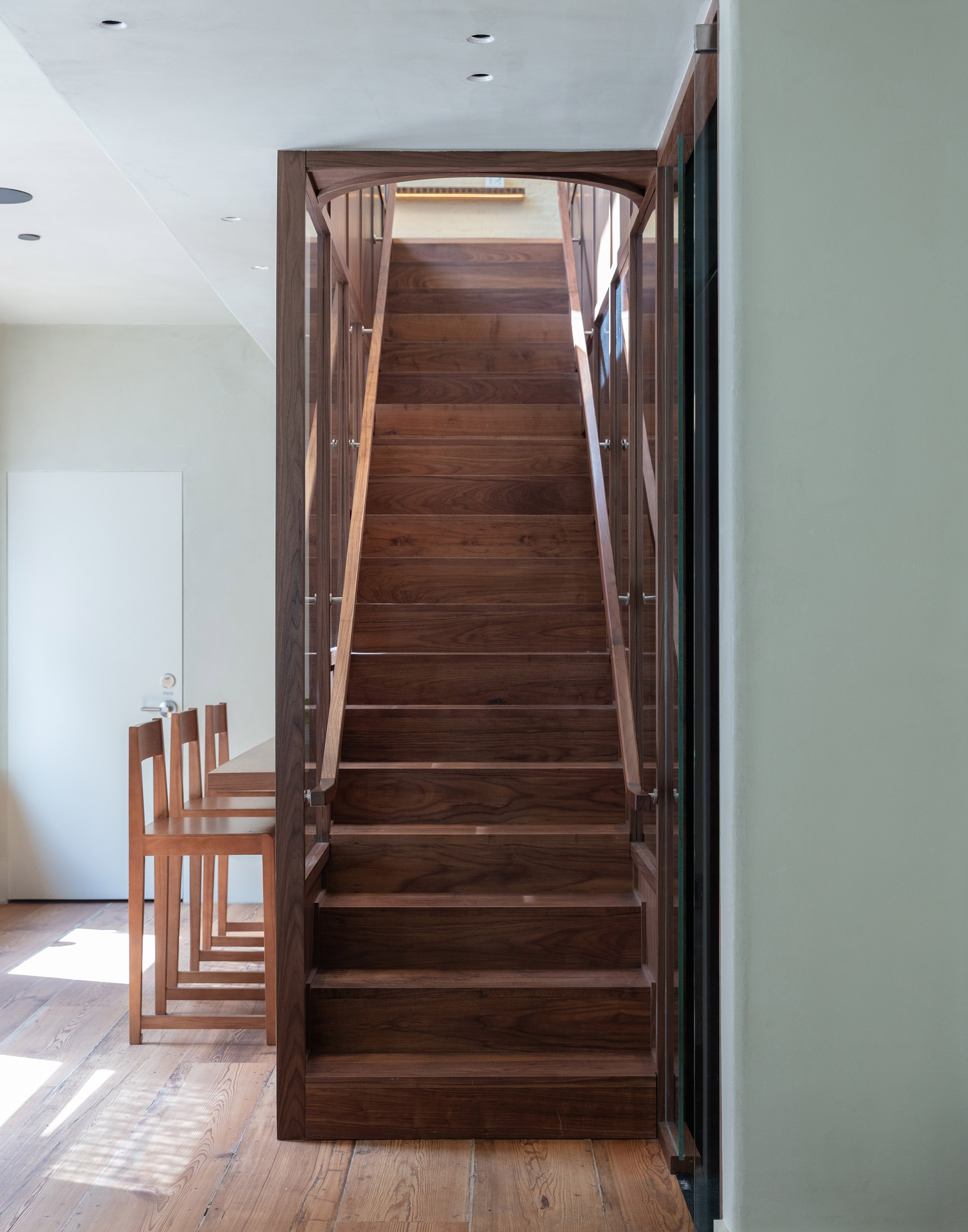 在處理空間的歷史層次時,Ciguë 表現出高度的尊重與自制。他們選擇保留原有的花旗松(Douglas fir)木地板,那些經年累月留下的磨損與色澤,如實記錄了建築的滄桑。與此形成鮮明對比的,是通往樓下、以全新核桃木打造的樓梯與家具。