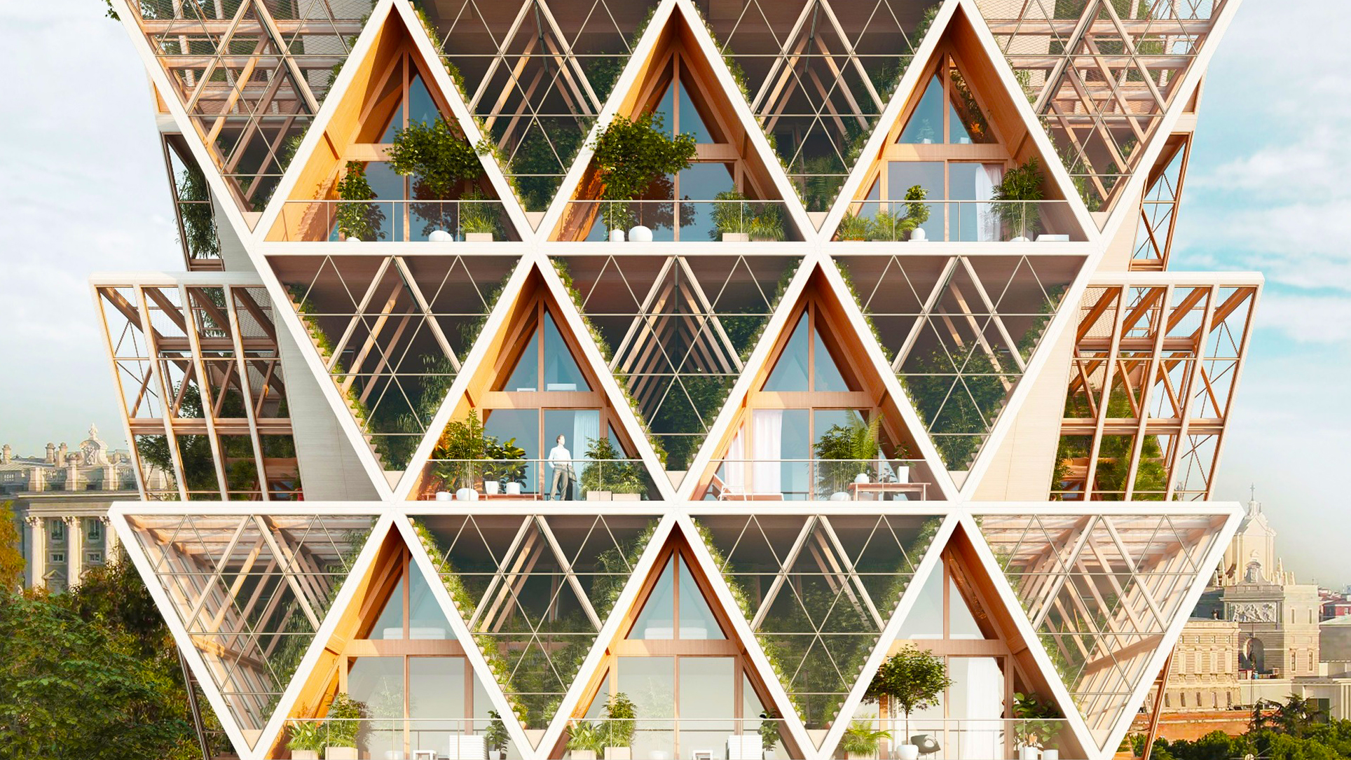 農場集合住宅整體由CLT模組化的建築系統組構,該系統在工廠預製後由卡車運輸至建築基地,預製模組化建築套件縮短了施工時間及其對周圍環境的影響,建築系統的基本架構是「A型框架房屋」,彼此以斜交方式連接形成整棟建築體,框架的每道牆壁都由三層構造形成,內層包括裝修面、水電管道,中間層有結構和隔溫層,外層則是種植單元和供水系統。