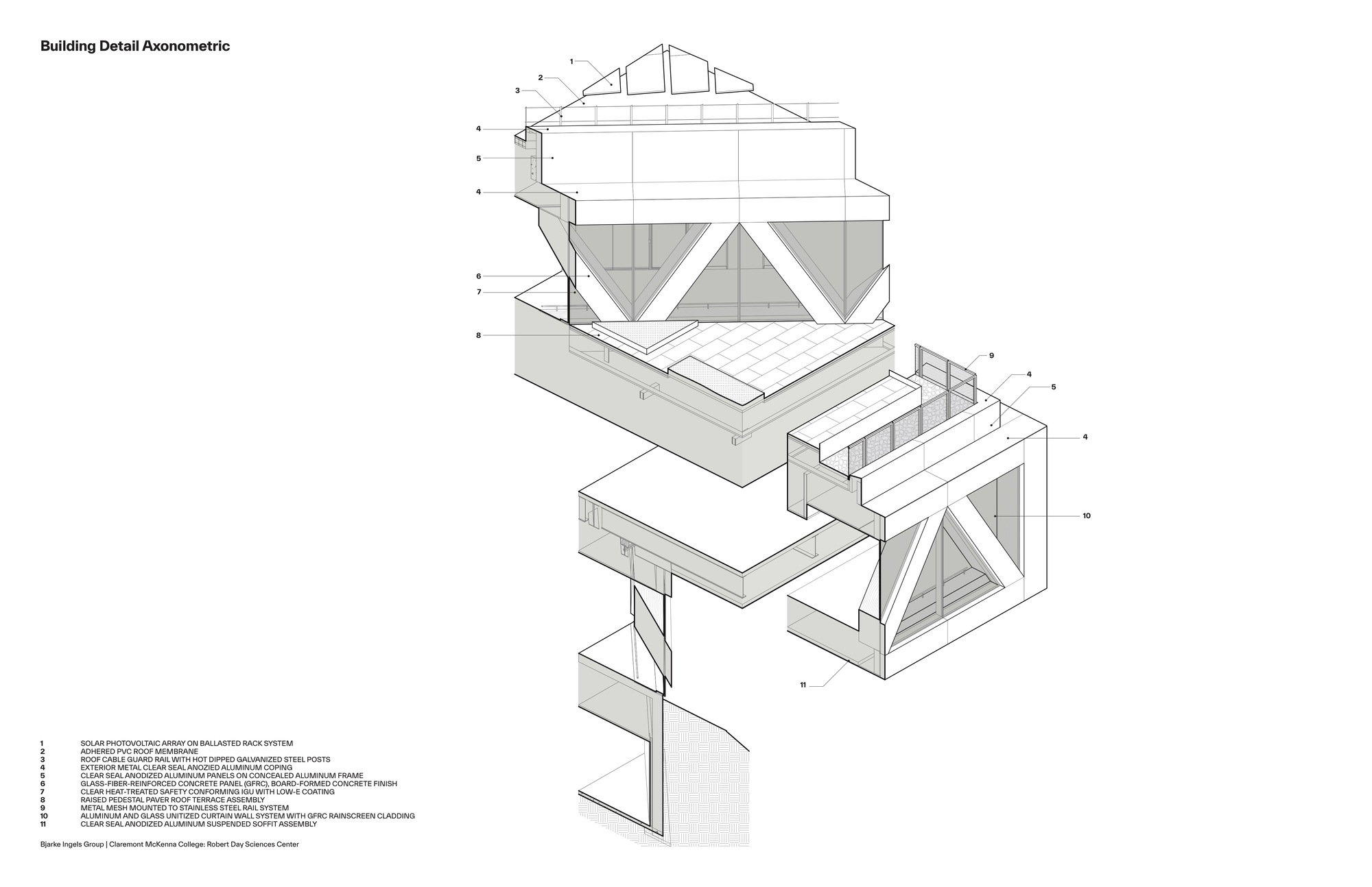 桁架的紋理、韻律感與幾何造型,更一路延伸至建築外部,在室內外之間,創造出幾乎無縫的視覺過渡。外牆則採用了玻璃纖維強化混凝土(GFRC)的板模面板,既營造出類似木材的溫潤質感,又提供了現代實驗室所需的高度耐久性與防火性能。