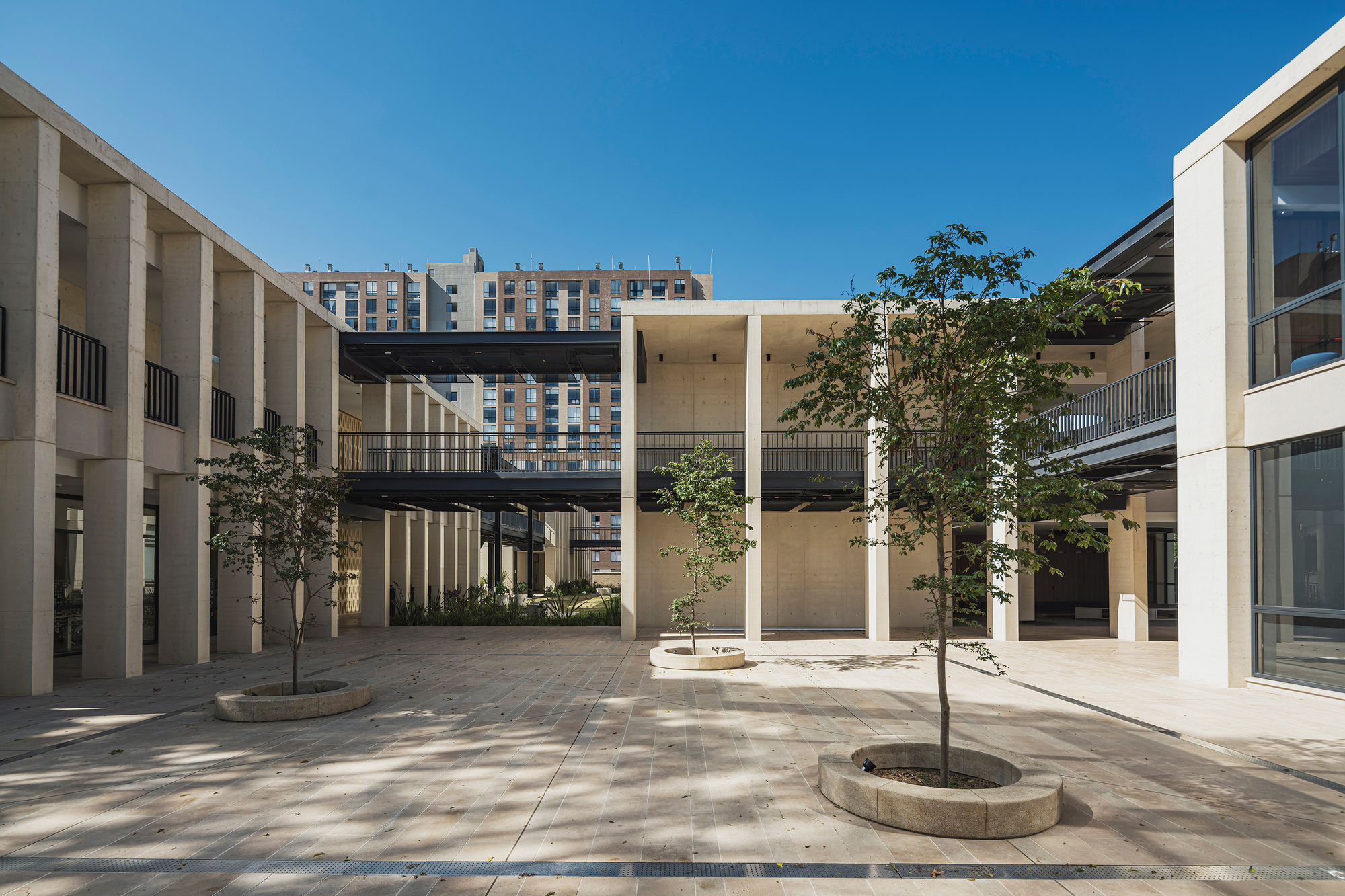 整個校園的機能被妥善分配於四棟可明確辨識的建築物之中,這些量體再藉由輕型結構體串接,最終匯聚於中央廣場與中庭。中庭是所有新建物中最具象徵意義的靈魂空間,它莊嚴地承載了社群對於歷史與傳統的敬意。這是一個奇特的場域,一個看似無事發生卻又包羅萬象的地方,它引導人們在進入知識學習的世界前,先行反思俗世與精神領域的連結。其驚人的雙倍挑高尺度,相較於周邊的建築顯得格外突出,卻也因此提供了必要的儀式感與崇高氛圍,無形中提升了學術在民族傳承與文化遺產保存中的至高地位,堪稱點睛之筆。