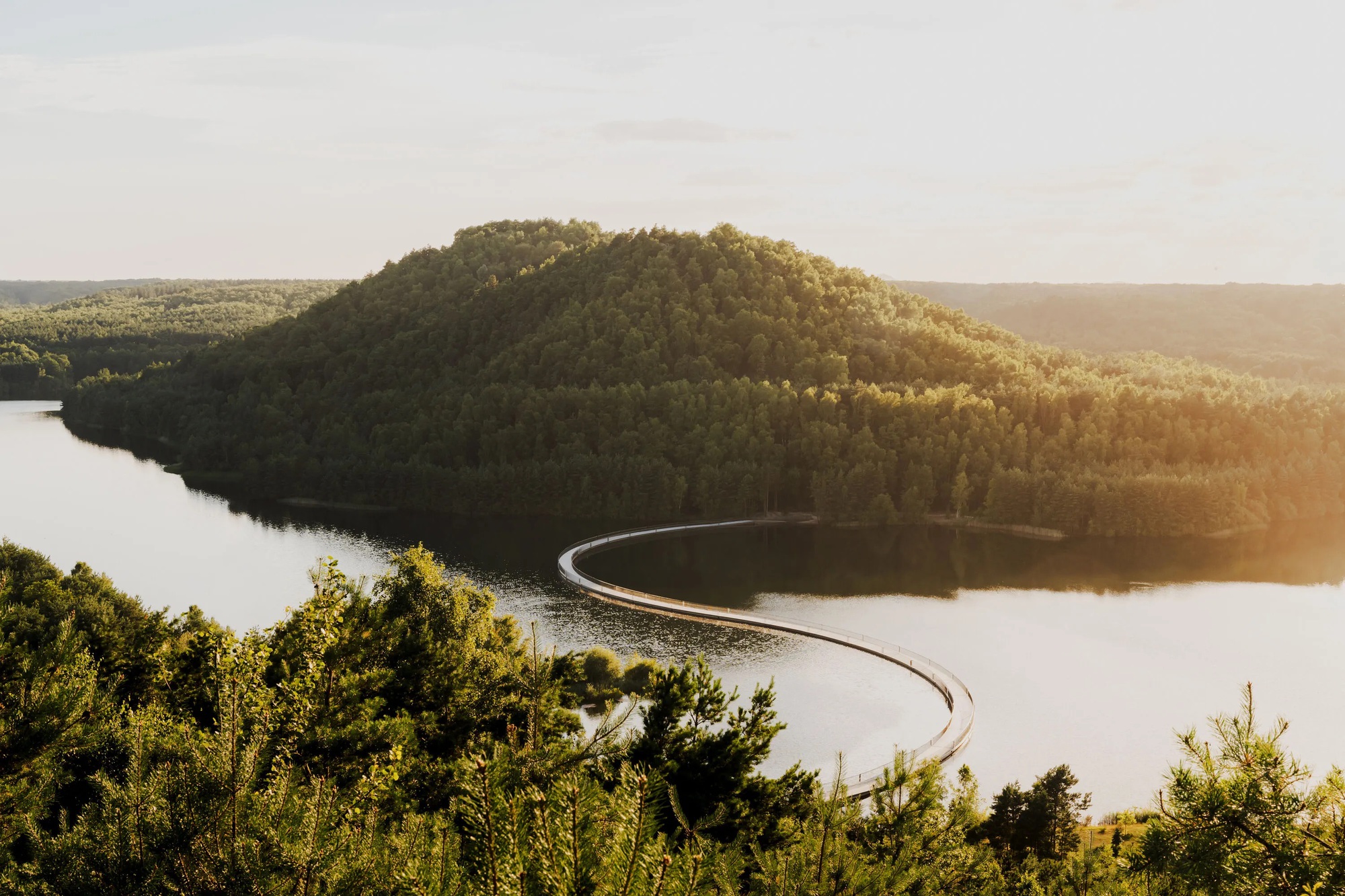 這座漂浮的橋樑,早已超越了單純的交通功能,它更像是一場建築與地景的交響樂。流暢的線條和有機的動態,既是對周遭自然環境的謙遜致敬,也為單車騎士和徒步者提供了一條引人入勝的路徑,讓人們得以全然沉浸於這片擁有豐厚工業歷史的寧靜環境之中。設計的巧思並不止於身,而是蔓延至整個宏偉的地景,使建築與周遭環境絲絲入扣。當訪客騎行或漫步於上時,會不自覺地被捲入這場精心編排的體驗,並為那種油然而生的人與自然的連結感到驚嘆,見證了基礎設施如何轉化為觸動人心的藝術品。