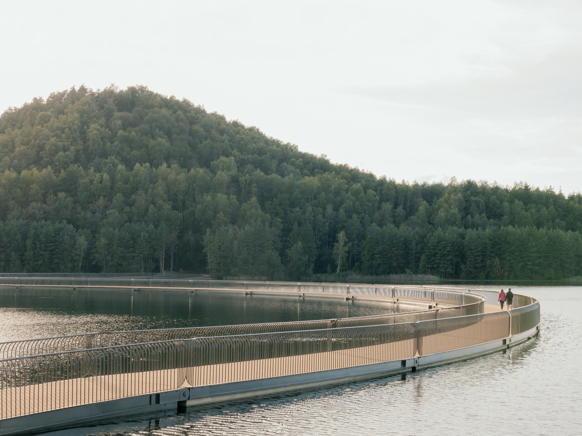 他們並未選擇以最經濟的直線橫跨水面,反而思慮著如何結合美學與工程力學,將體塑造成一道順應黃金比例分割的有機曲線。這樣的設計絕非故弄玄虛,而是為了創造一種獨特的行進經驗。蜿蜒的路徑自然而然地減緩了騎士的速度,迫使人們放慢步調,視線隨著體的轉折而移動,時而聚焦於波光粼粼的湖面,時而眺望遠方的礦山輪廓。這使得穿越過程本身,就成為一趟充滿豐富視覺變化的地景巡禮。