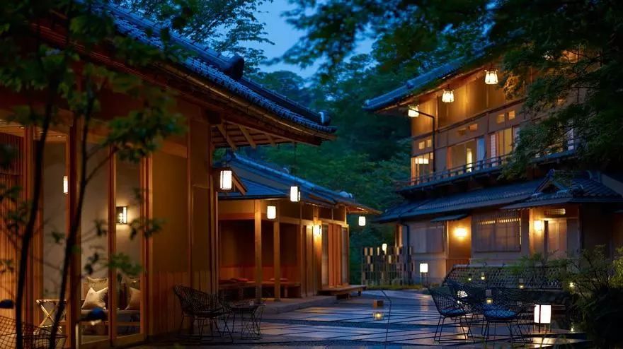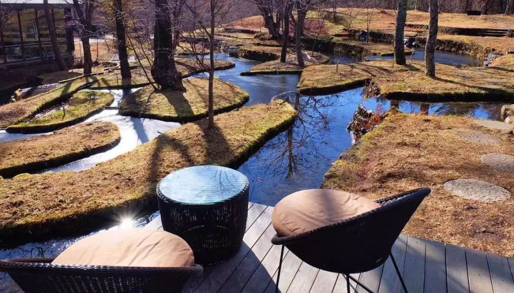 虹夕諾雅的創世之作輕井澤就位於淺間山的山麓平地上。在這裡,東利惠利用優越的自然條件,將酒店客房以日本傳統村落的配置進行排列,以周邊的水流為紐帶將散落的客房連接起來,形成了療癒系山間水居的效果。