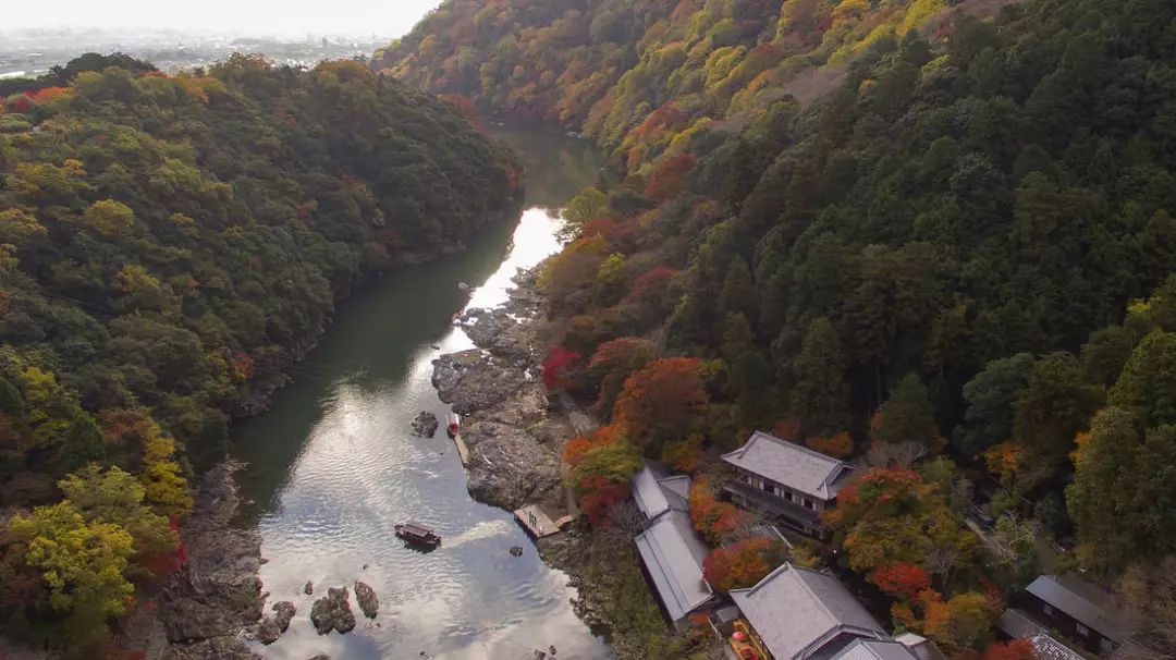 這裡擁有被Conde Nast Traveler稱為「全球最隆重華美的入場式」。因為在這裡旅客首先要在碼頭乘坐渡船,搭著小船溯溪而上,越過大堰川,才能抵達位於嵐山深處的山隱酒店。