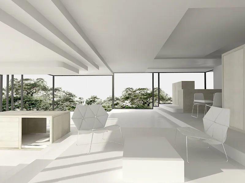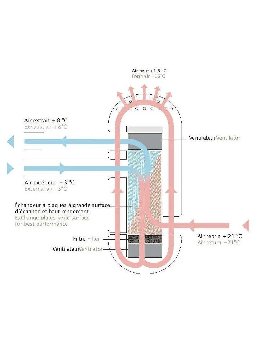 全白的外牆反射輻射、減輕熱量吸收,建築內部進行了絕佳的隔熱保護。為了塑造不同的氣候,Philippe Rahm 在不同空間裡分解各個要素——反照率、輻射率、水密性、隔熱性、結構支承……一般而言這些要素會融為一體,均勻地呈現在建築的每個部分上。而在這個建築裡,減少空調用量到極致,主要靠自然風降溫,並把以上要素分別巧妙地安排在其合適的地方:不是所有的房間或走廊都需要隔熱層,需要干爽的空間才選取不透水材料,人員聚集的辦公場所才安裝冷氣。